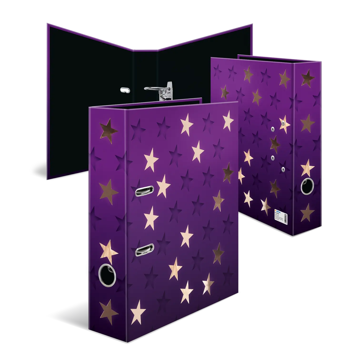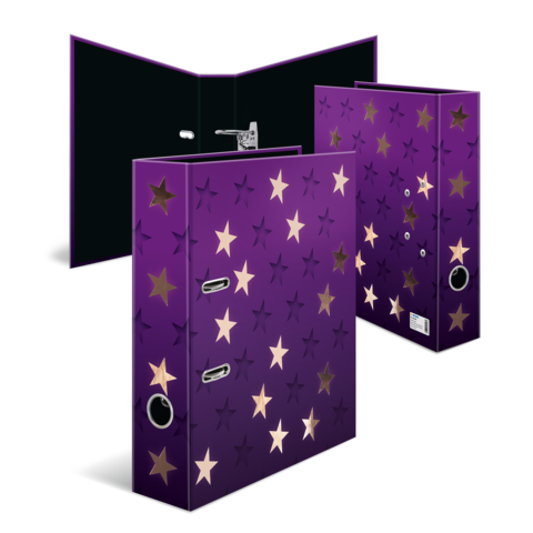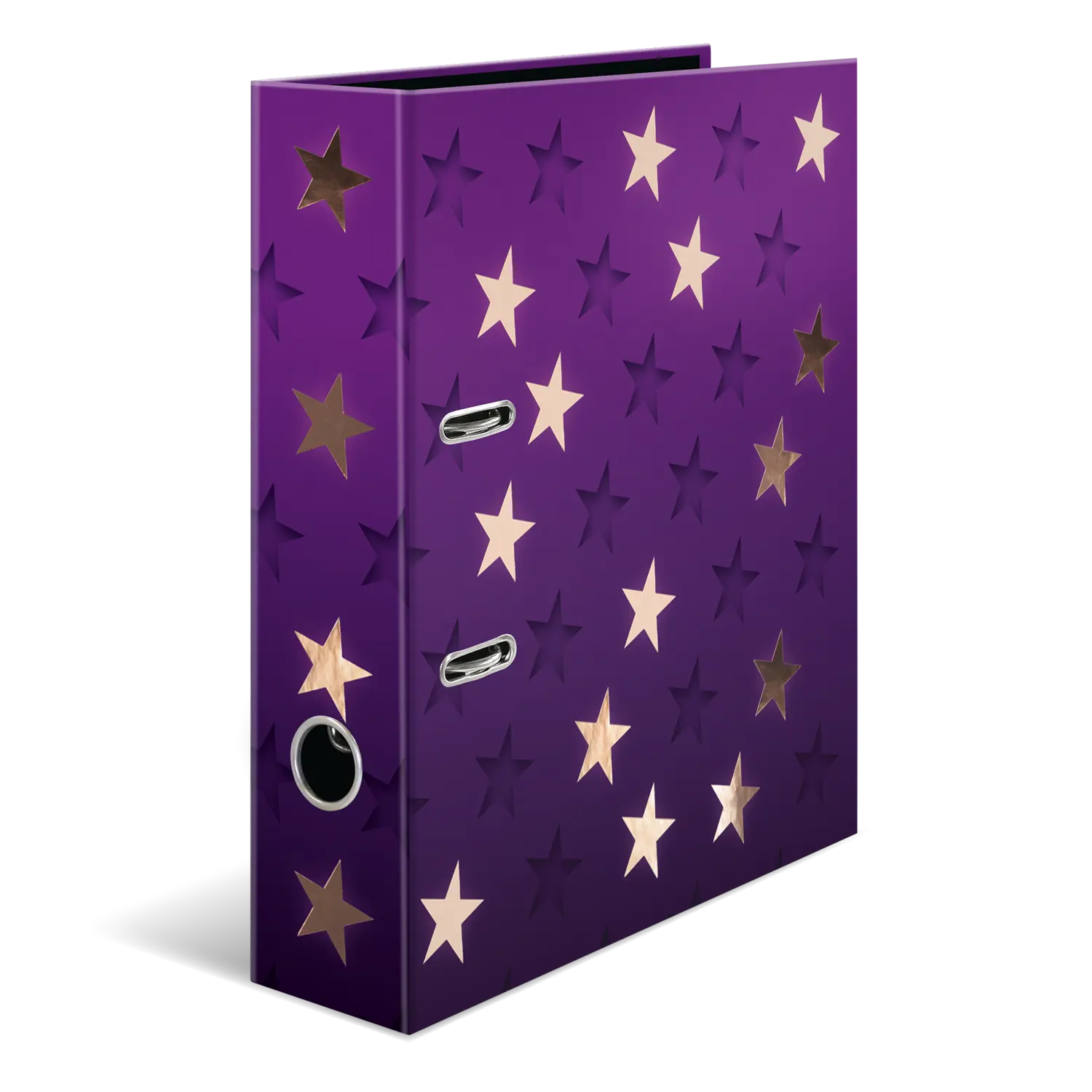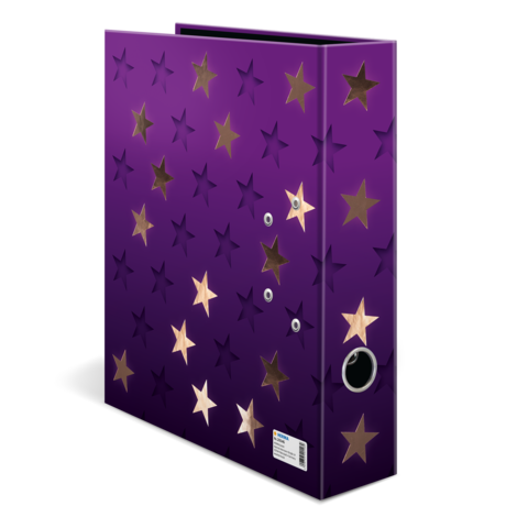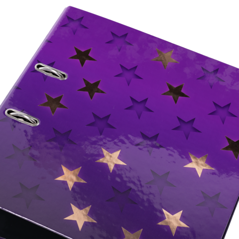 De motief ordner "Stars" is heel bijzonder, omdat deze design en functionaliteit op het hoogste niveau combineert. Het diep donkerpaarse ontwerp in combinatie met de glanzende, glinsterende roségouden folie a fwerking laat de sterren van het motief stralen als aan de nachtelijke hemel. Het stijlvolle diepte effect maakt de map bovendien extra opvallend en zorgt ervoor dat de sterren er bijna gestanst uitzien. Een hoogtepunt en blikvanger! De map is gemaakt van hoogwaardig karton, afgewerkt met roségouden folie en dankzij het praktische grijpgat gemakkelijk te pakken en weer terug te plaatsen. Het speciale hefboommechaniek met metalen klem zorgt ervoor dat de inhoud van de map netjes en stabiel bij elkaar blijft. De brede rug garandeert stabiliteit in de kast en voldoende ruimte voor veel documenten tot DIN A4 formaat.