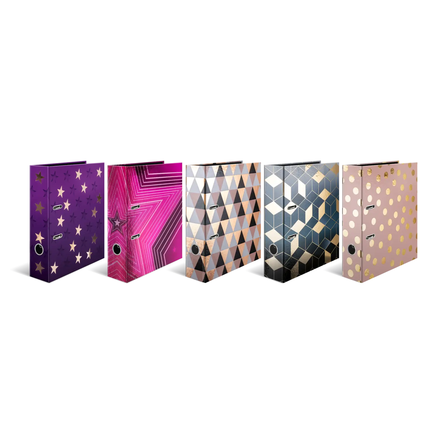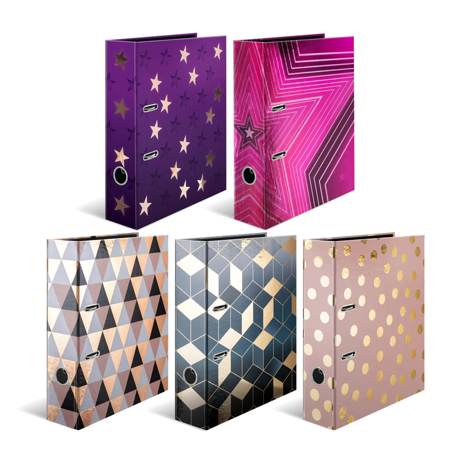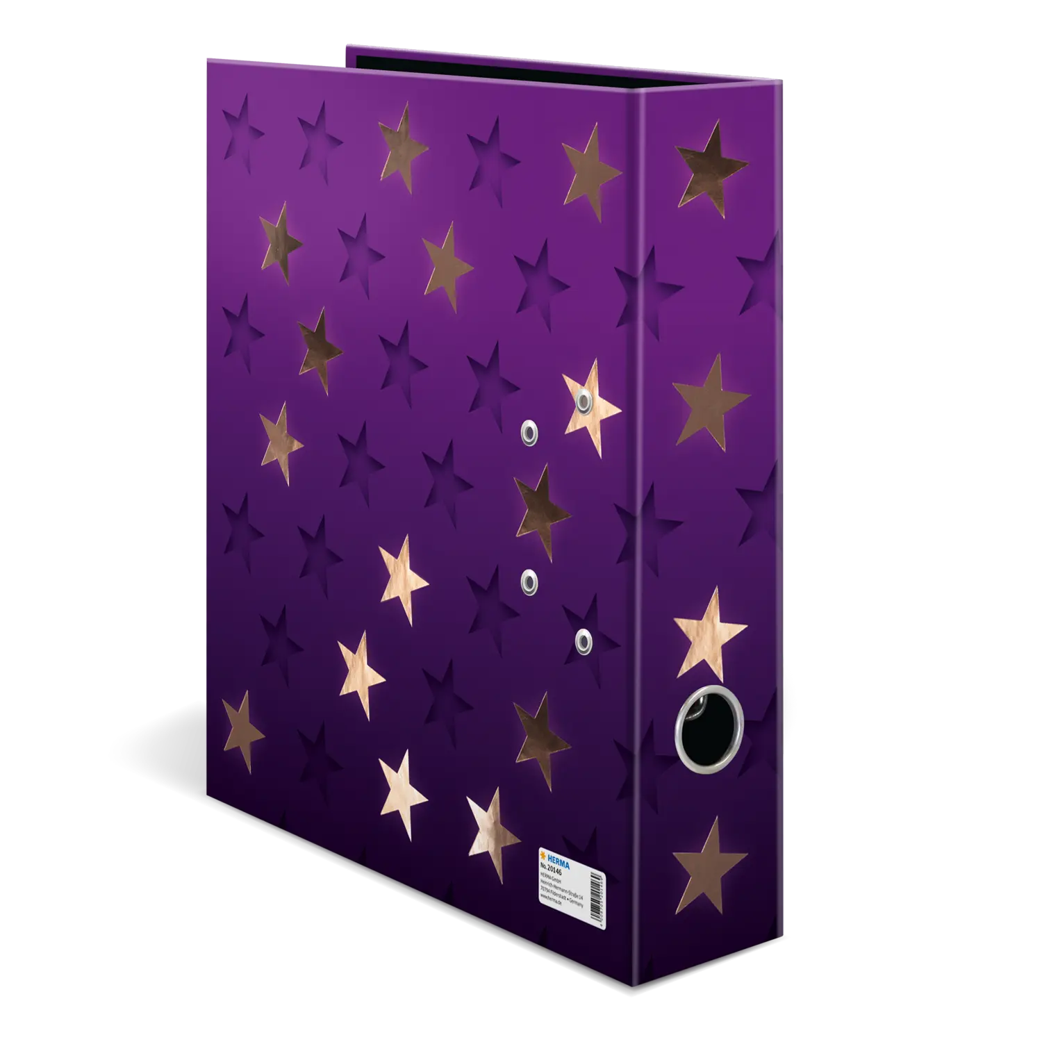 De motief ordner "Stars" is heel bijzonder, omdat deze design en functionaliteit op het hoogste niveau combineert. Het diep donkerpaarse ontwerp in combinatie met de glanzende, glinsterende roségouden folie a fwerking laat de sterren van het motief stralen als aan de nachtelijke hemel. Het stijlvolle diepte effect maakt de map bovendien extra opvallend en zorgt ervoor dat de sterren er bijna gestanst uitzien. Een hoogtepunt en blikvanger! De map is gemaakt van hoogwaardig karton, afgewerkt met roségouden folie en dankzij het praktische grijpgat gemakkelijk te pakken en weer terug te plaatsen. Het speciale hefboommechaniek met metalen klem zorgt ervoor dat de inhoud van de map netjes en stabiel bij elkaar blijft. De brede rug garandeert stabiliteit in de kast en voldoende ruimte voor veel documenten tot DIN A4 formaat.