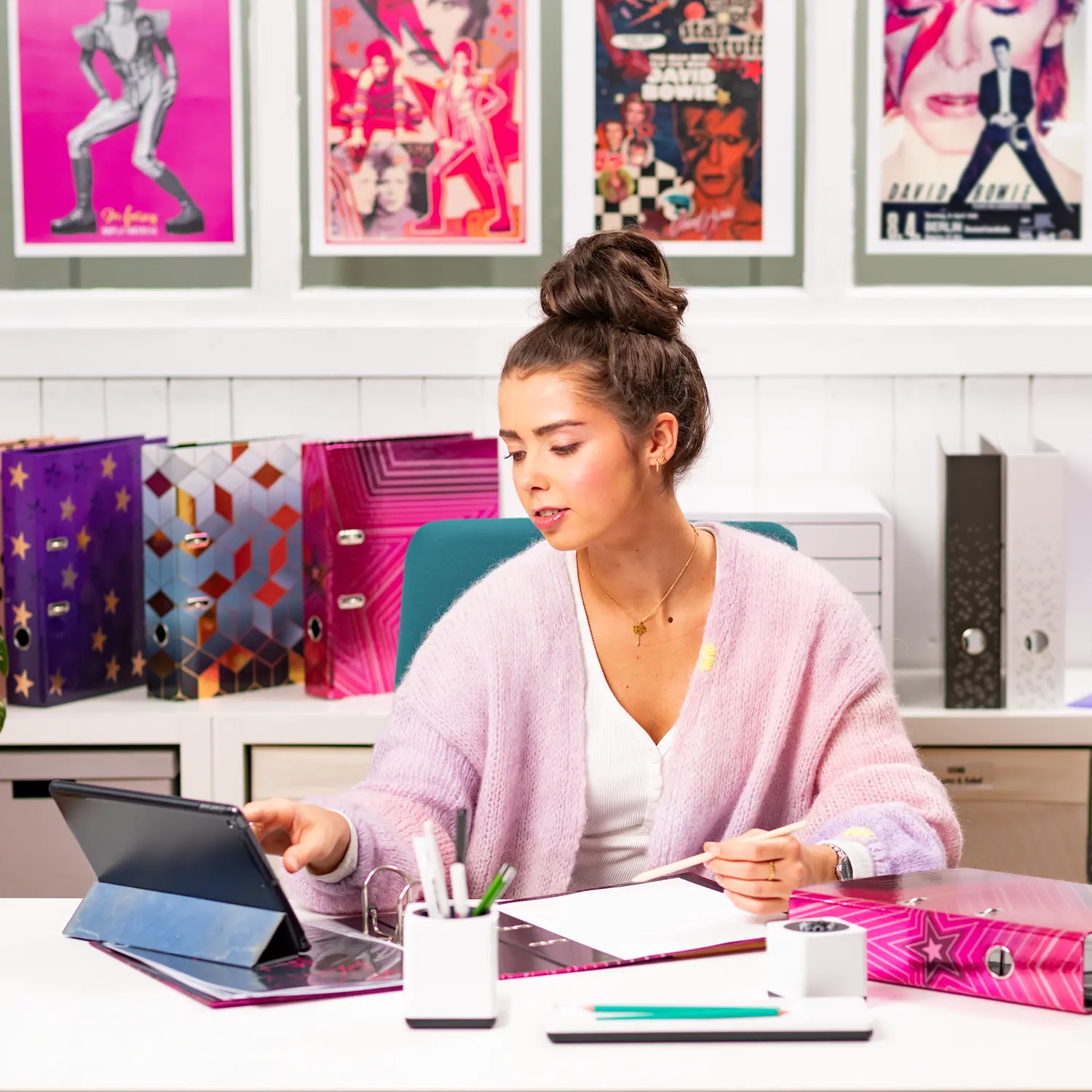 De motief ordner "Venus" is heel bijzonder, omdat deze design en functionaliteit op het hoogste niveau combineert. Het opvallende, stralende roze ontwerp, bezaaid met bijna lichtgevende sterren, is een absoluut hoogtepunt en zeker een blikvanger! De map is gemaakt van hoogwaardig karton, afgewerkt met een speciaal drukproces op spiegelende folie en dankzij het praktische grijpgat gemakkelijk te pakken en weer terug te plaatsen. Het speciale hefboommechaniek met metalen klem zorgt ervoor dat de inhoud van de map netjes en stabiel bij elkaar blijft. De brede rug garandeert stabiliteit in de kast en voldoende ruimte voor veel documenten tot DIN A4 formaat.