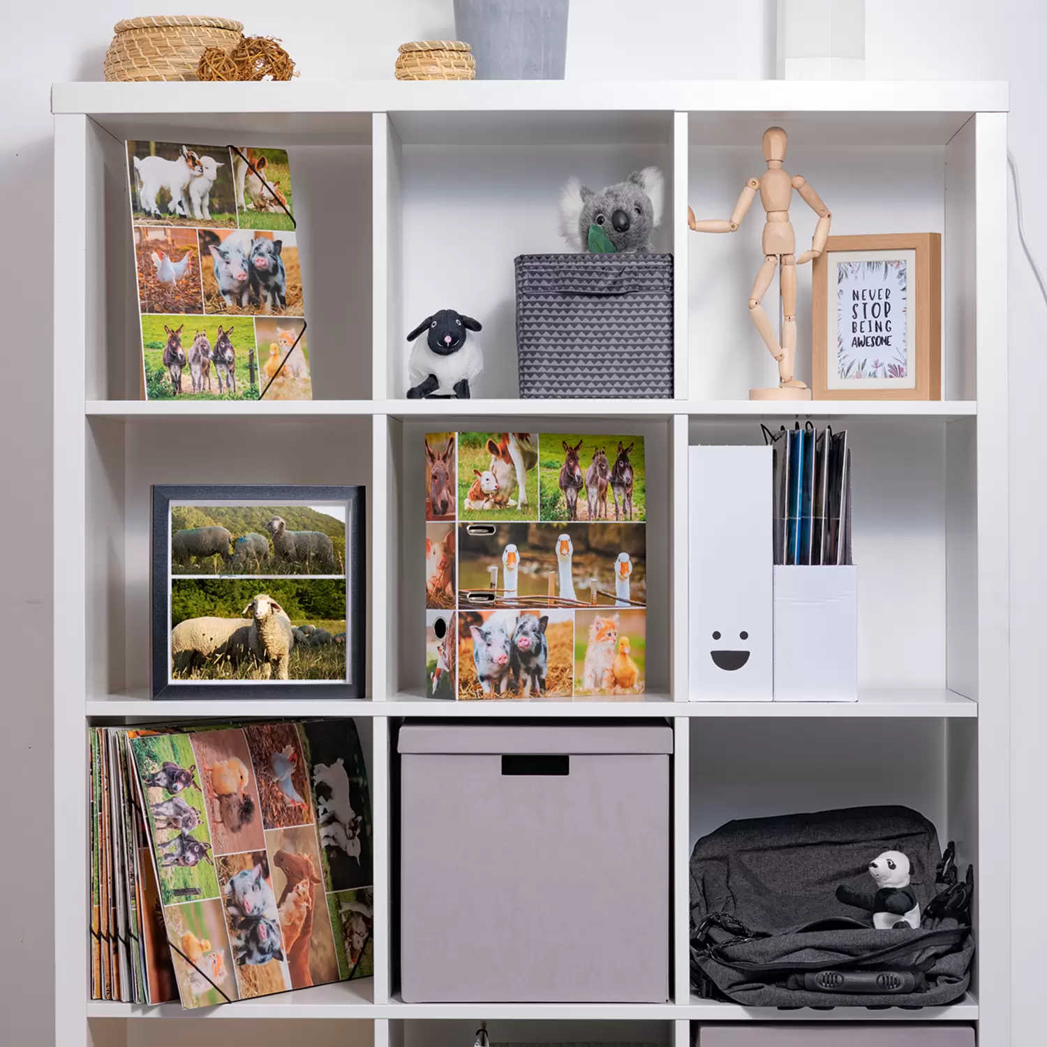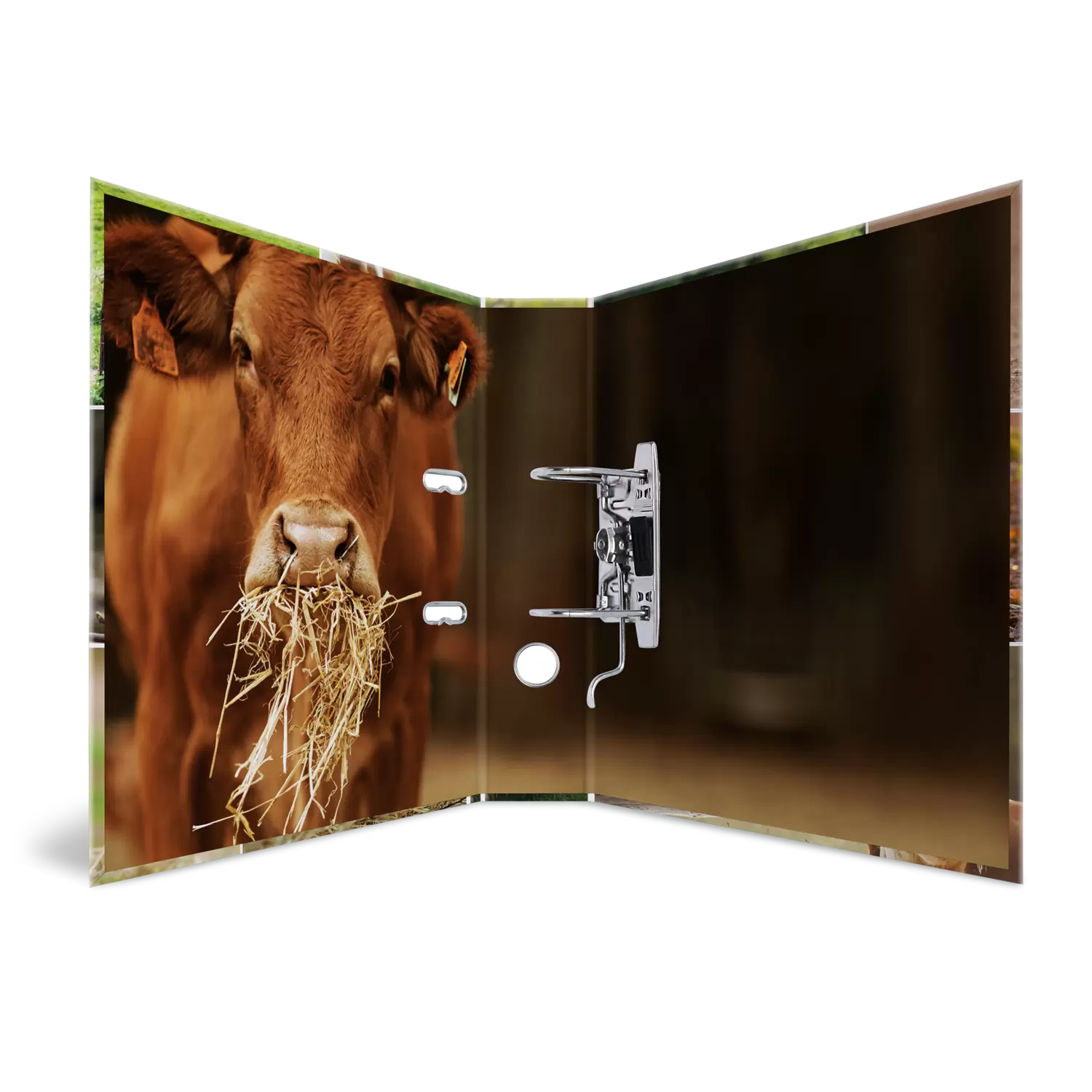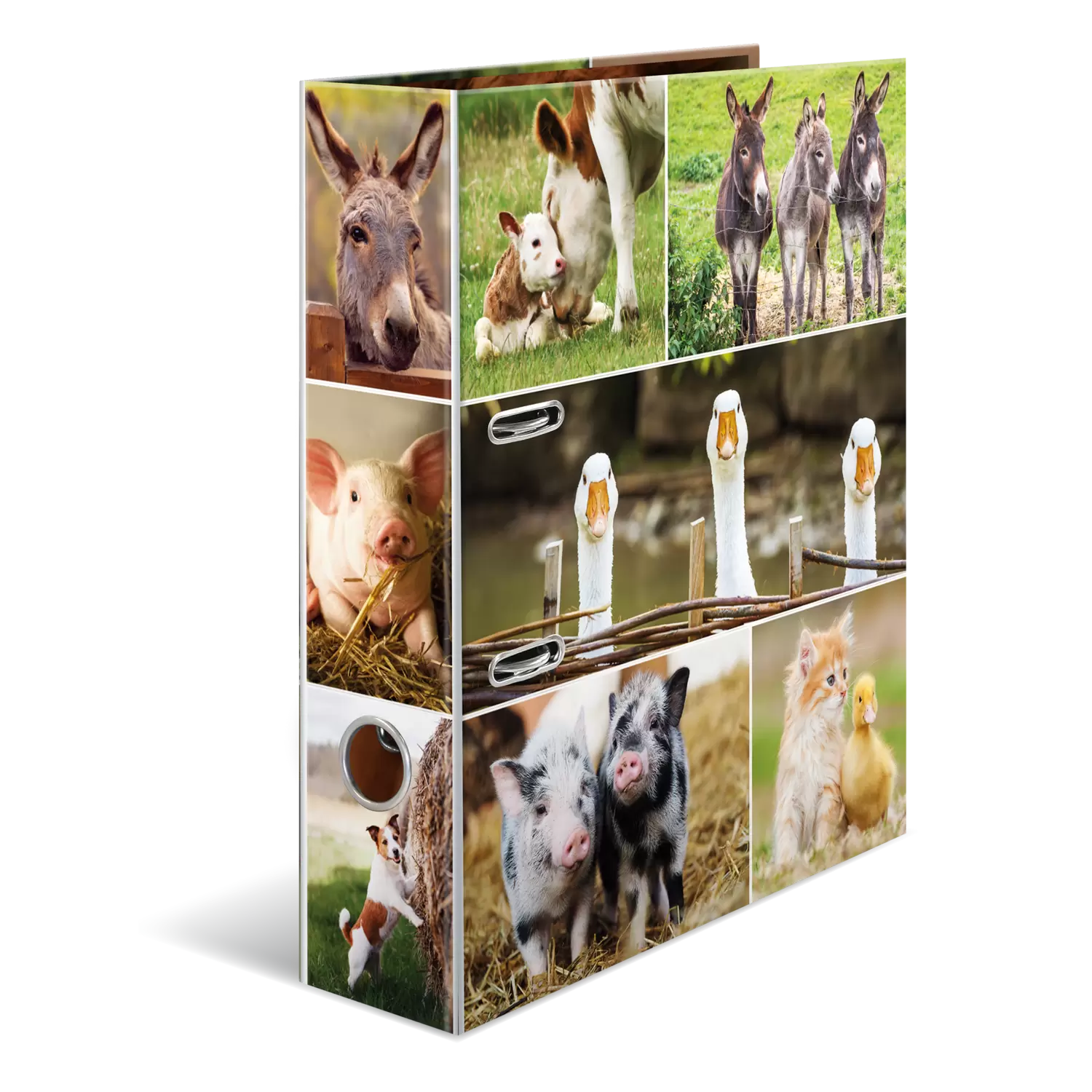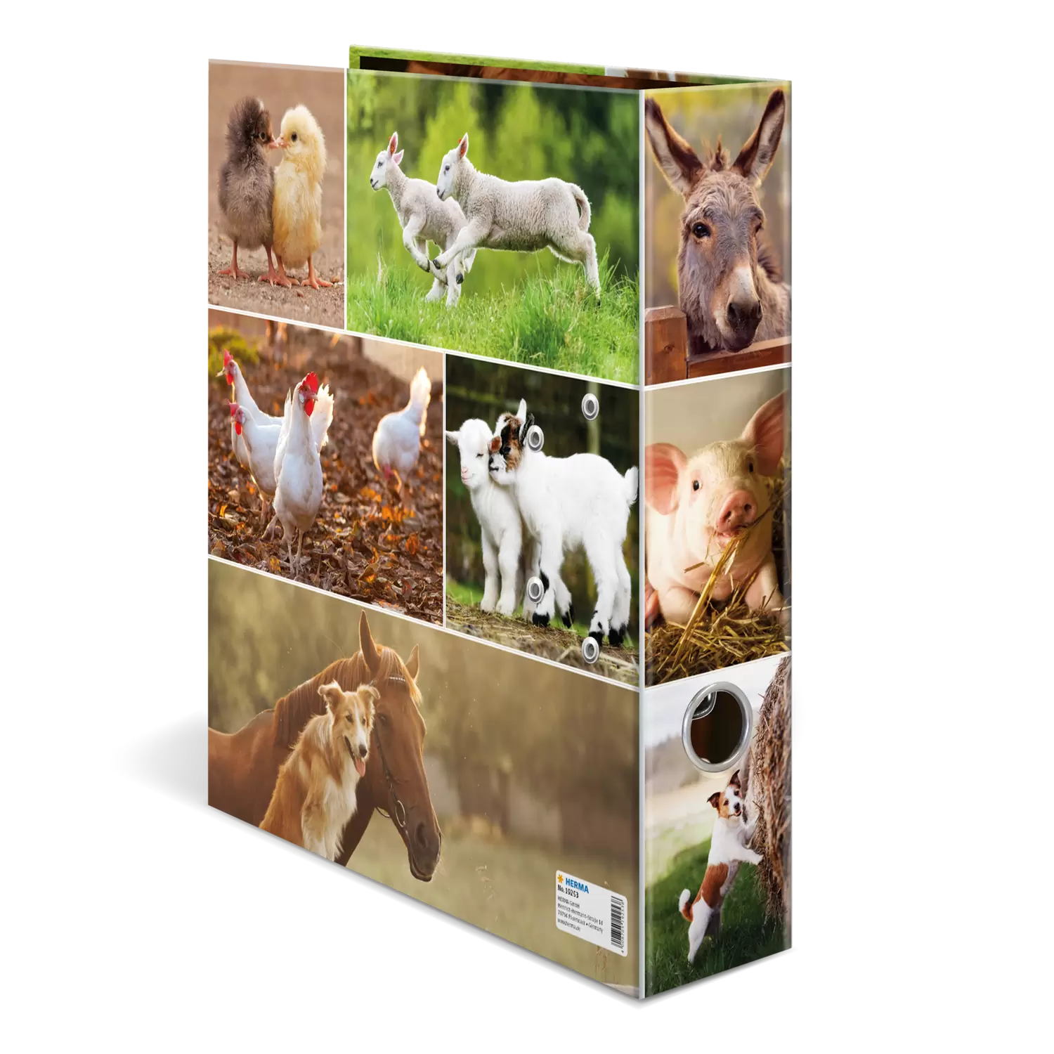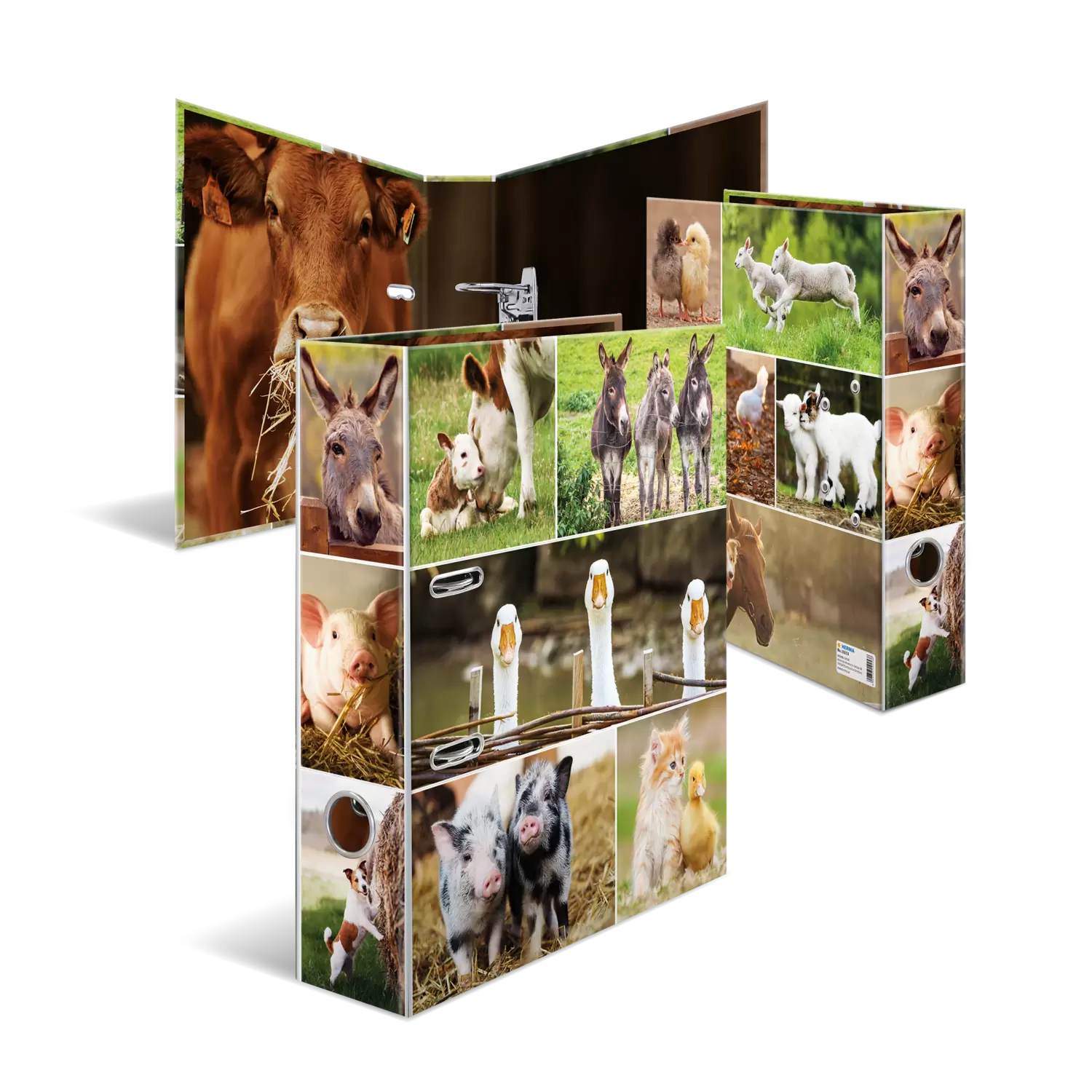 DIN A4 thema-ordner met prachtige foto's van boerderijdieren. Ideaal voor boerderijfans, die hun tijd het liefst doorbrengen in de stal of in de wei, te midden van koeien, geiten en kippen. De ordner is hoogwaardig gemaakt van stevig karton, met handig vingergat en hefboommechanisme (incl. klem), bedrukt aan de binnenzijde, voor het optimaal opbergen van geperforeerde documenten en transparante hoezen. Voor optimale orde thuis, op school, universiteit of op kantoor en tegelijkertijd een echte blikvanger.