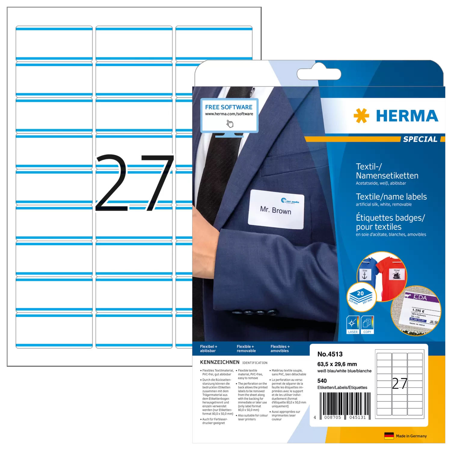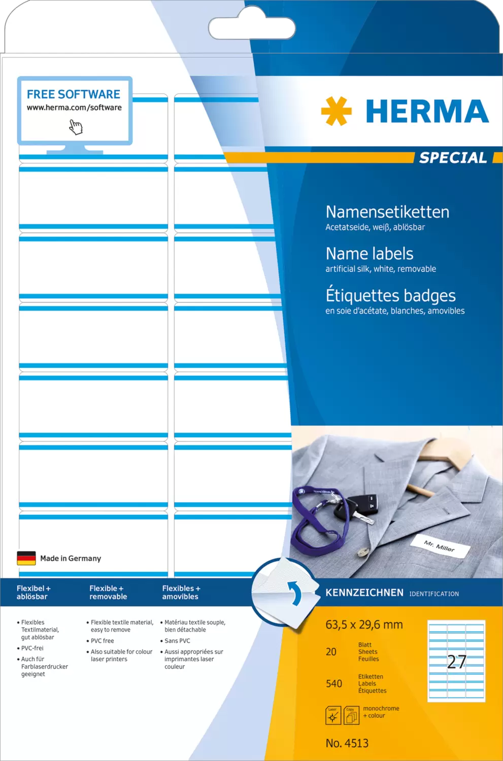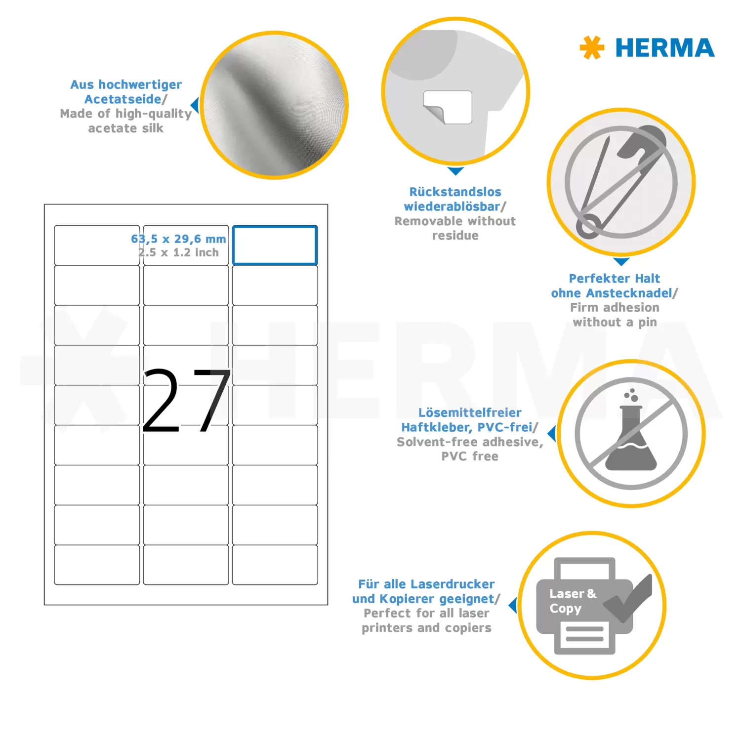 Etiketten van acetaatzijde, op A4-vellen, zelfklevend. Ideaal geschikt voor seminars, vergaderingen, beurzen of voor het labelen van stoffen, tapijten en matrassen. Praktisch alternatief voor plastic plaatjes: snel beschreven, perfect hechtend zonder speldje. Flexibel textielmateriaal, goed hechtend, goed verwijderbaar. Attentie: niet op fijn leer of fijne textiel, bijv. zijde, fluweel of corduroy plakken. Voor laserprinters, kopieerapparaten, kleurenlaserprinters en kleurenkopieerapparaten. Niet geschikt voor inkjetprinters. Gratis softwareoplossingen: www.herma.com/software