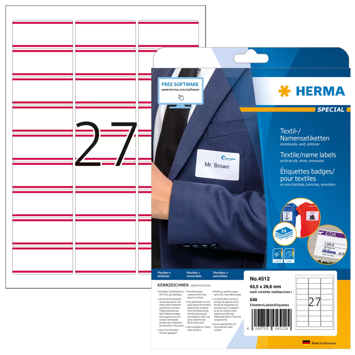 Naam/textieletiketten, verwijderbaar, A4, 63,5 x 29,6 mm, wit/rood, van acetaatzijde, te bedrukken