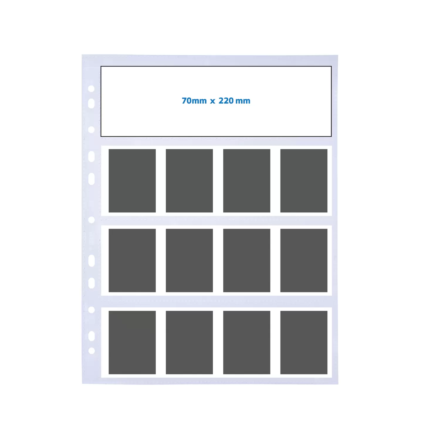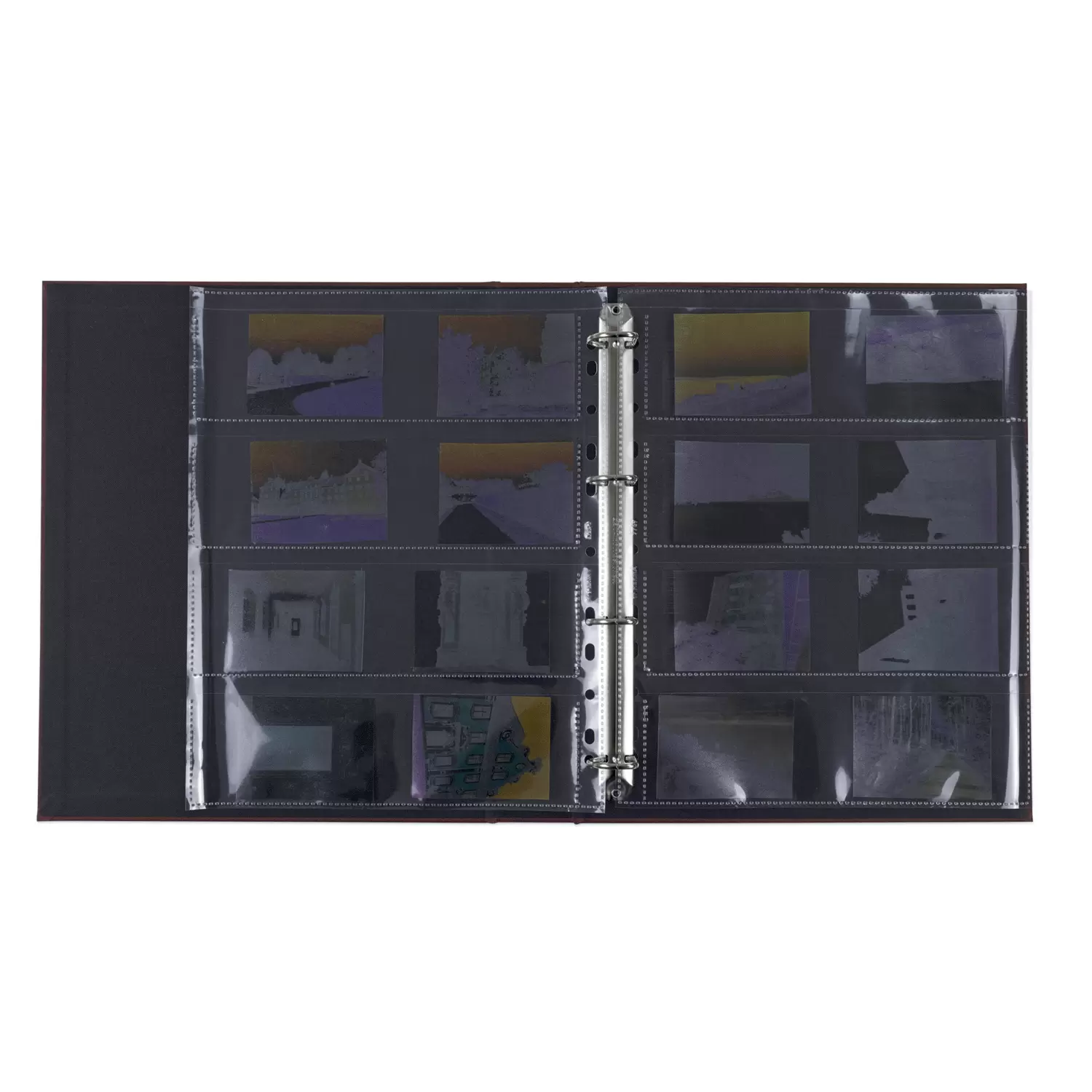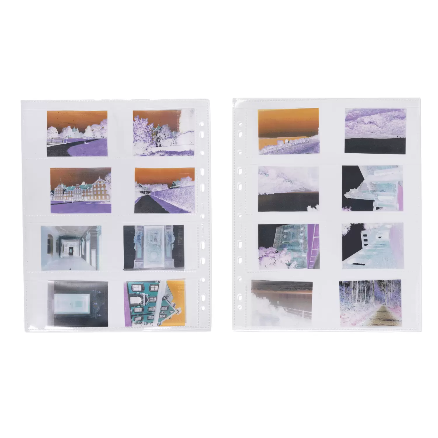 De Herma negatievenhoesjes voor middelgrote formaten zijn ideaal voor het netjes en overzichtelijk bewaren en archiveren van negatieven. Ze zijn gemaakt van transparant, robuust en weekmakervrij polypropyleen en bieden per hoesje plek aan 4 strips tot 70 x 220 mm of 12 losse foto's van het formaat 70 x 55 mm. Bijzonder eraan zijn de speciale beschermflapjes die voorkomen dat de negatieven uit de hoesjes kunnen vallen. Zo kunnen de negatieven er gemakkelijk worden ingestoken en uitgenomen en zijn desondanks optimaal beschermd. Een hoesje is ca. 24,3 x 30,3 cm groot en kan dankzij de europerforatie gemakkelijk in ordners, ringbanden of fotoboeken worden opgeborgen. Voor het optimaal vasthouden worden varianten met 4-rings systeem aanbevolen. Er zitten 100 hoesjes in een verpakking en dus is er voldoende plek voor max. 1200 negatieven.