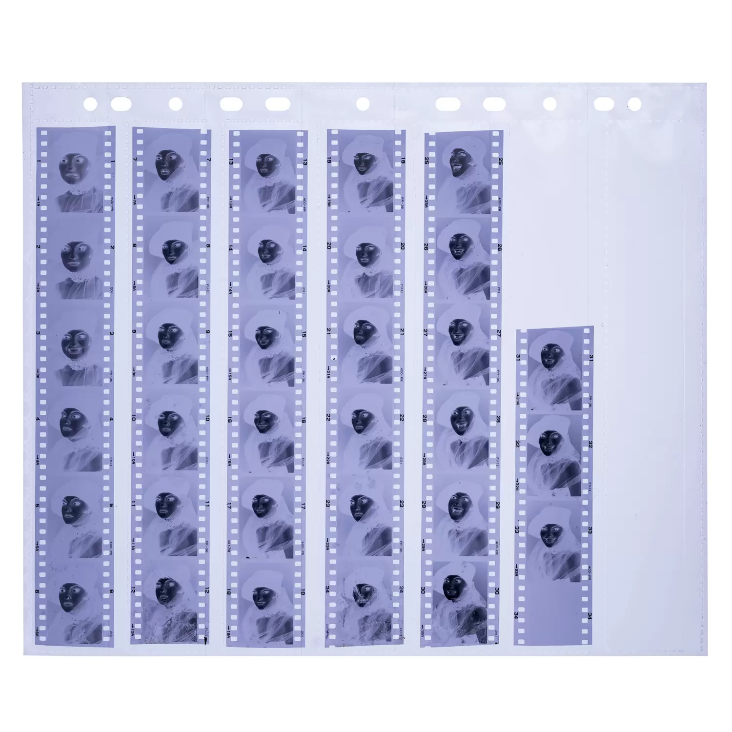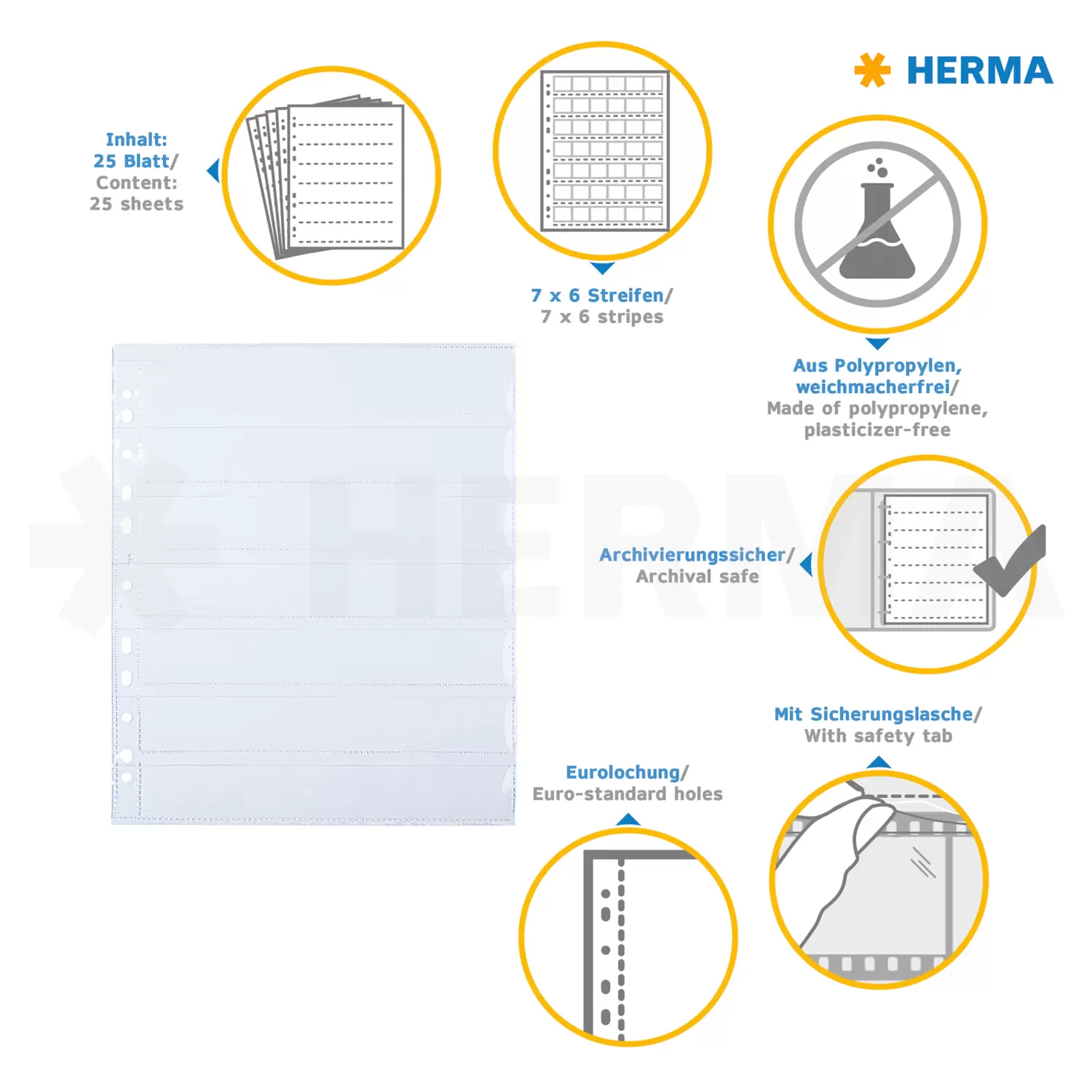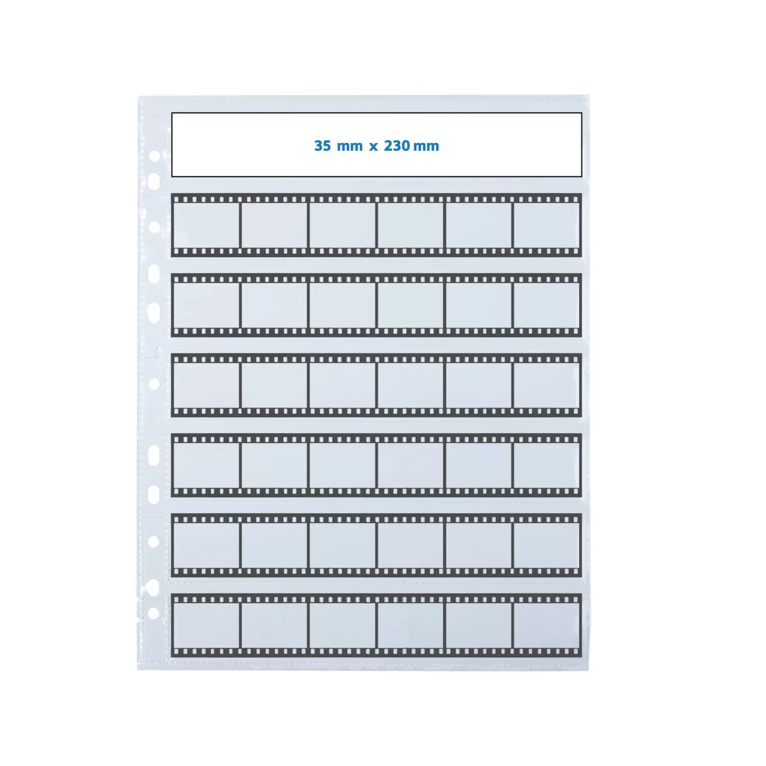 De Herma negatievenhoesjes voor kleinbeeldnegatieven zijn ideaal voor het netjes en overzichtelijk bewaren en archiveren van negatievenstrips. Ze zijn gemaakt van transparant, robuust en weekmakervrij polypropyleen en bieden per hoesje plek voor 7 strips à 6 foto's van het formaat 35 mm. Bijzonder eraan zijn de speciale beschermflapjes die voorkomen dat de negatieven uit de hoesjes kunnen vallen. Zo kunnen de negatieven er gemakkelijk worden ingestoken en uitgenomen en zijn desondanks optimaal beschermd. Een hoesje is ca. 25,3 x 29,9 cm groot en kan dankzij de europerforatie gemakkelijk in ordners, ringbanden of fotoboeken worden opgeborgen. Voor het optimaal vasthouden worden varianten met 4-rings systeem aanbevolen. Er zitten 25 hoesjes in een verpakking en dus is er voldoende plek voor max. 175 strips en 1.050 negatieven.