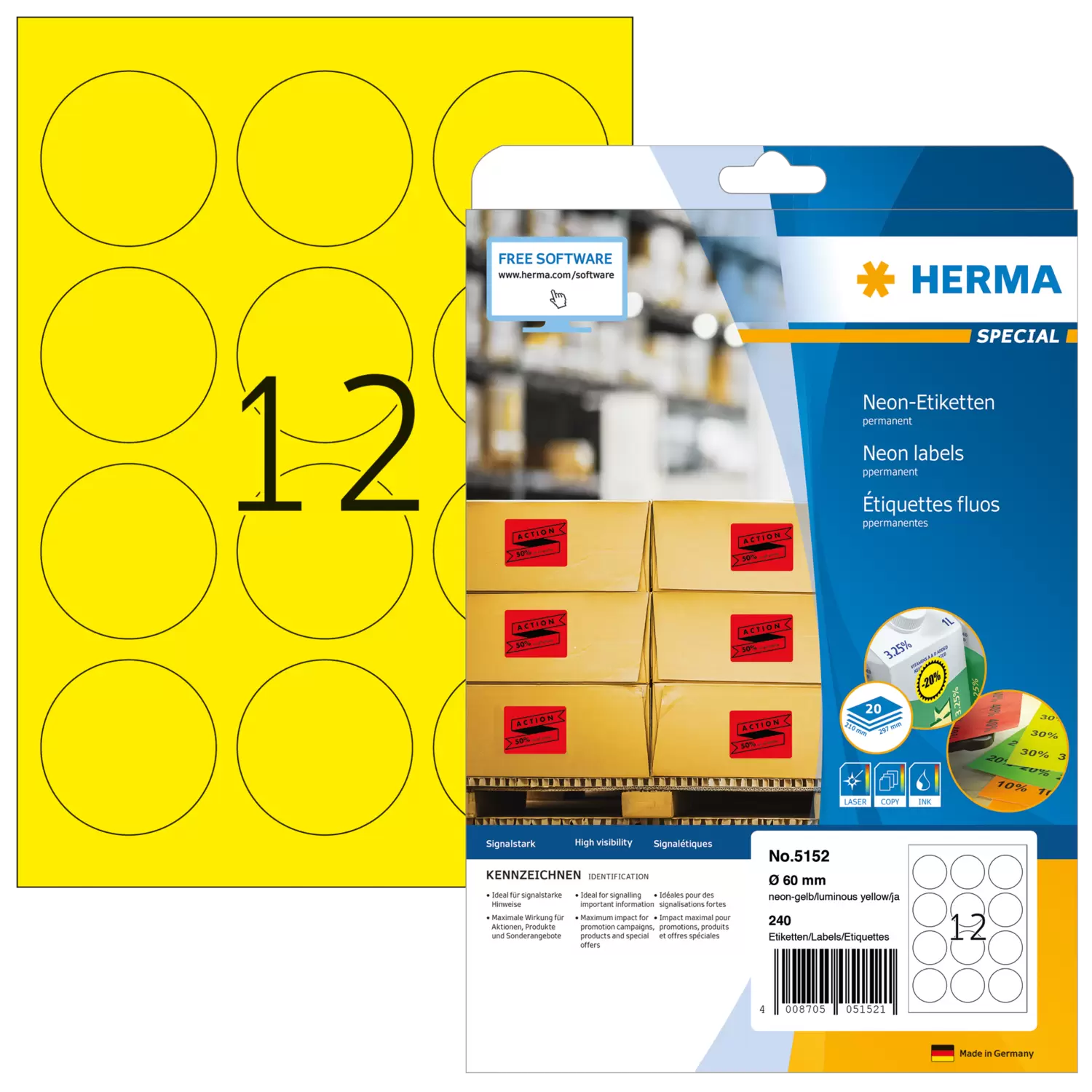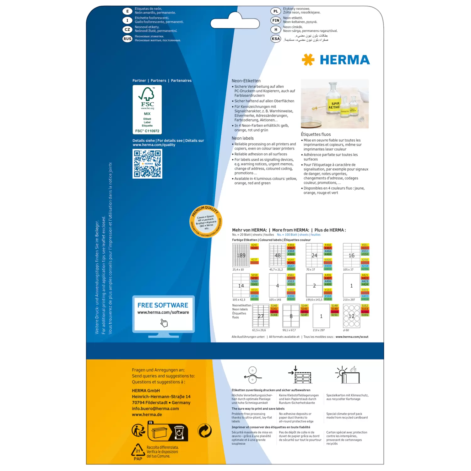 Etiketten in neonkleuren voor informatie met signaalfunctie, op A4-vellen, zelfklevend. Opvallend en informatief: ideaal voor het labelen met signaalfunctie, bijv. waarschuwingen, spoedaantekeningen, acties, kleurcoderingen. In 4 neonkleuren met sterke signaalfunctie, FSC® Mix Credit-gecertificeerd. Voor laser- en inkjetprinters, kopieerapparaten, kleurenlaserprinters en kleurenkopieerapparaten. Storingvrije verwerking dankzij veiligheidsrand rondom en optimale vlakligging. Gratis softwareoplossingen: www.herma.com/software.