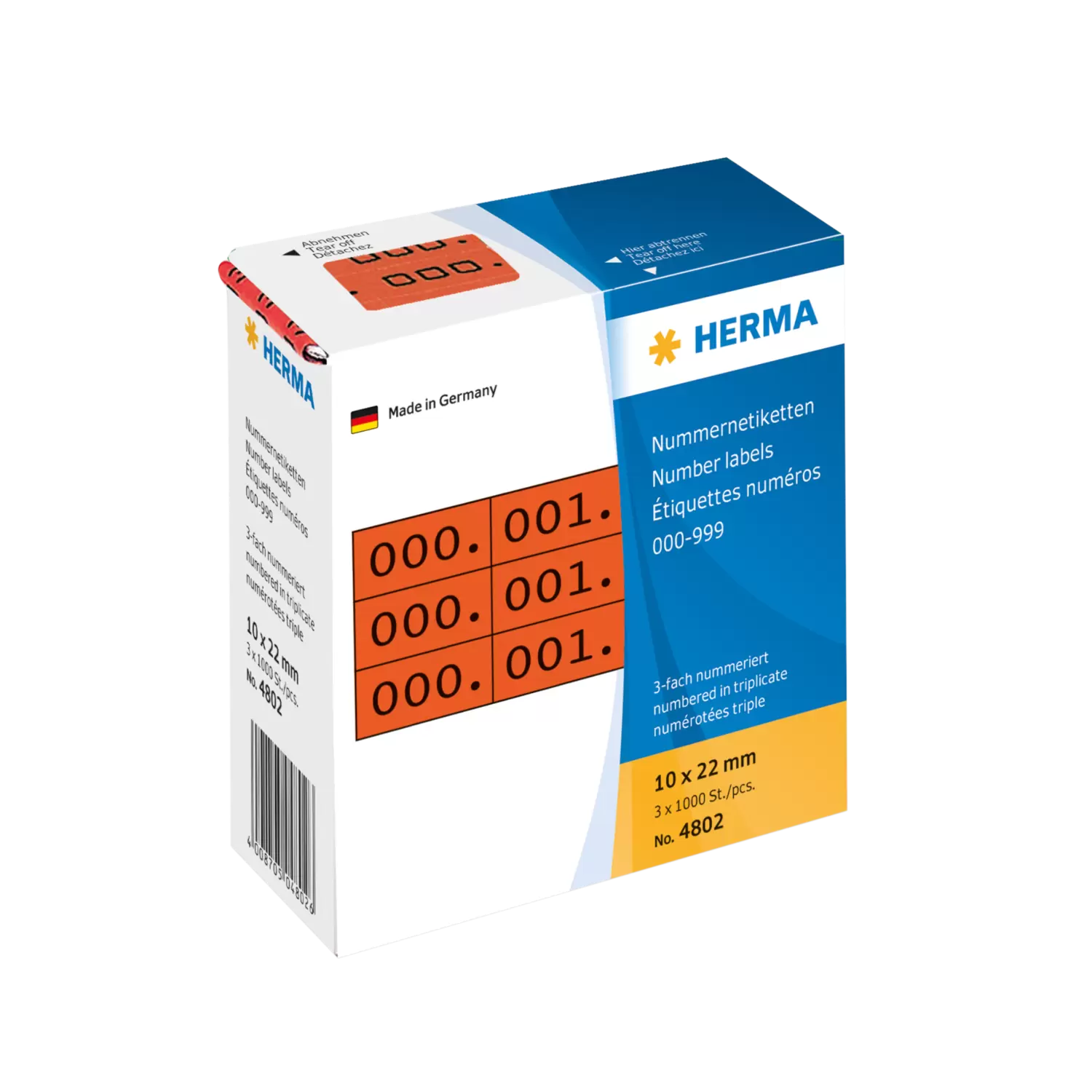 Zelfklevende nummeretiketten van schrijfpapier. Drie etiketten 10 x 22 mm naast elkaar met drie identieke nummers. Zwarte opdruk op gekleurdeondergrond. Doorlopend genummerd van 0 tot 999. 1000 drievoudigenummers in kartonnen dispenser.
