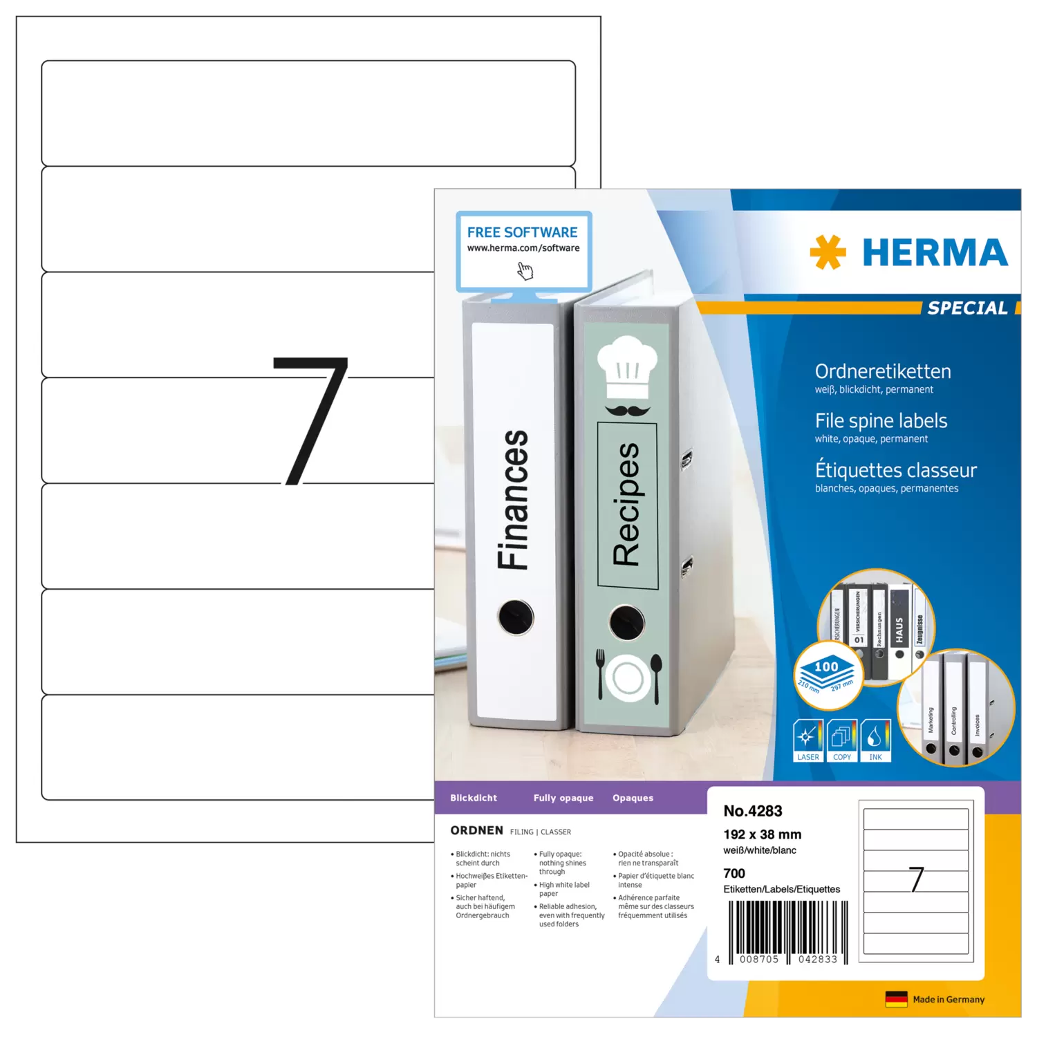 Ordneretiketten, op A4-vellen, zelfklevend. Voor een uniform uiterlijk op kantoor en thuis. Geschikt voor alle gangbare ordners. Absoluut ondoorzichtig materiaal met een hoge witheidsgraad, oude ordneropschriften schijnen niet door. Blanco: ideaal voor bedrijfslogo, opschriften en ordneraantekeningen. Goed hechtend ook bij veelvuldig gebruik van de ordner. Milieuvriendelijk: hoogwaardig, chloorvrij gebleekt speciaal papier, FSC® Mix Credit-gecertificeerd, oplosmiddelvrije contactlijm. Etiketten zijn 100 % recyclebaar met het oud papier, verpakking van gerecycled karton. Zeer goede drukresultaten op alle laser- en inkjetprinters, kopieerapparaten, kleurenlaserprinters en kleurenkopieerapparaten. Storingvrije verwerking dankzij veiligheidsrand rondom en optimale vlakligging. Gratis softwareoplossingen: www.herma.com/software.