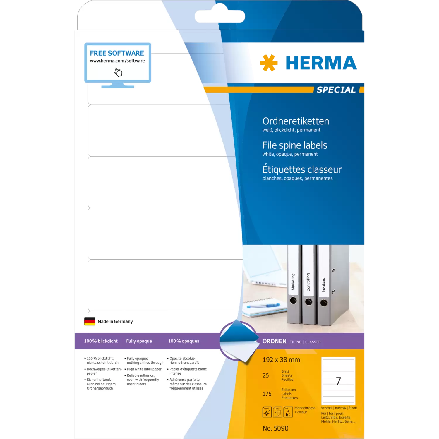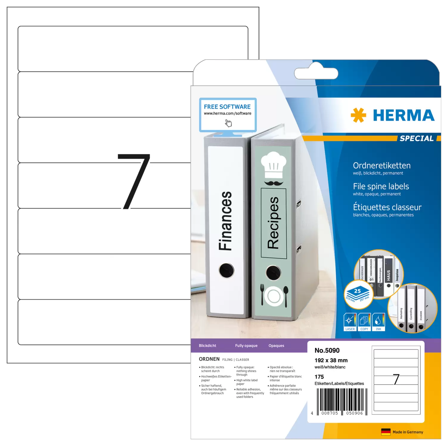 Ordneretiketten, op A4-vellen, zelfklevend. Voor een uniform uiterlijk op kantoor en thuis. Geschikt voor alle gangbare ordners. Absoluut ondoorzichtig materiaal met een hoge witheidsgraad, oude ordneropschriften schijnen niet door. Blanco: ideaal voor bedrijfslogo, opschriften en ordneraantekeningen. Goed hechtend ook bij veelvuldig gebruik van de ordner. Milieuvriendelijk: hoogwaardig, chloorvrij gebleekt speciaal papier, FSC® Mix Credit-gecertificeerd, oplosmiddelvrije contactlijm. Etiketten zijn 100 % recyclebaar met het oud papier, verpakking van gerecycled karton. Zeer goede drukresultaten op alle laser- en inkjetprinters, kopieerapparaten, kleurenlaserprinters en kleurenkopieerapparaten. Storingvrije verwerking dankzij veiligheidsrand rondom en optimale vlakligging. Gratis softwareoplossingen: www.herma.com/software.