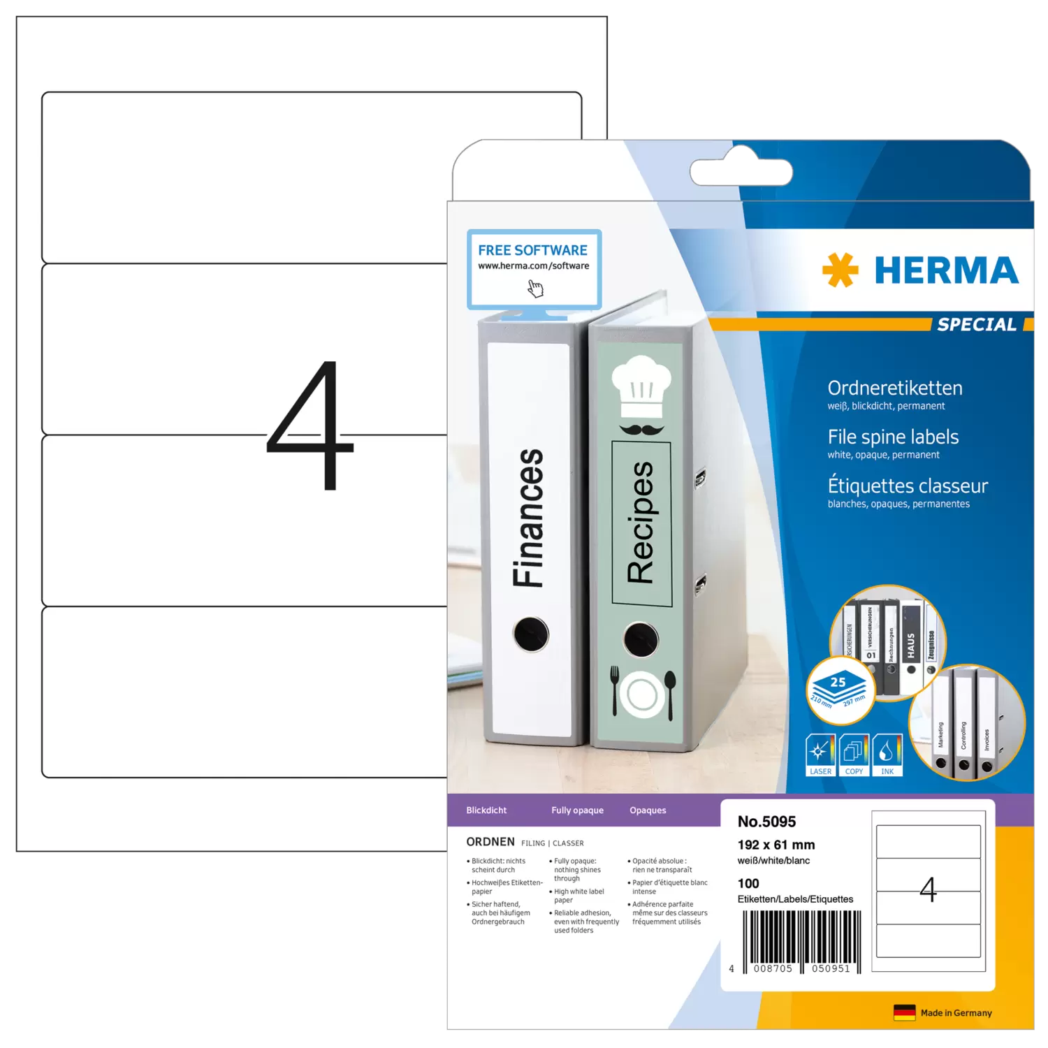 Ordneretiketten, A4, 192 x 61 mm, wit, ondoorzichtig, permanent hechtend