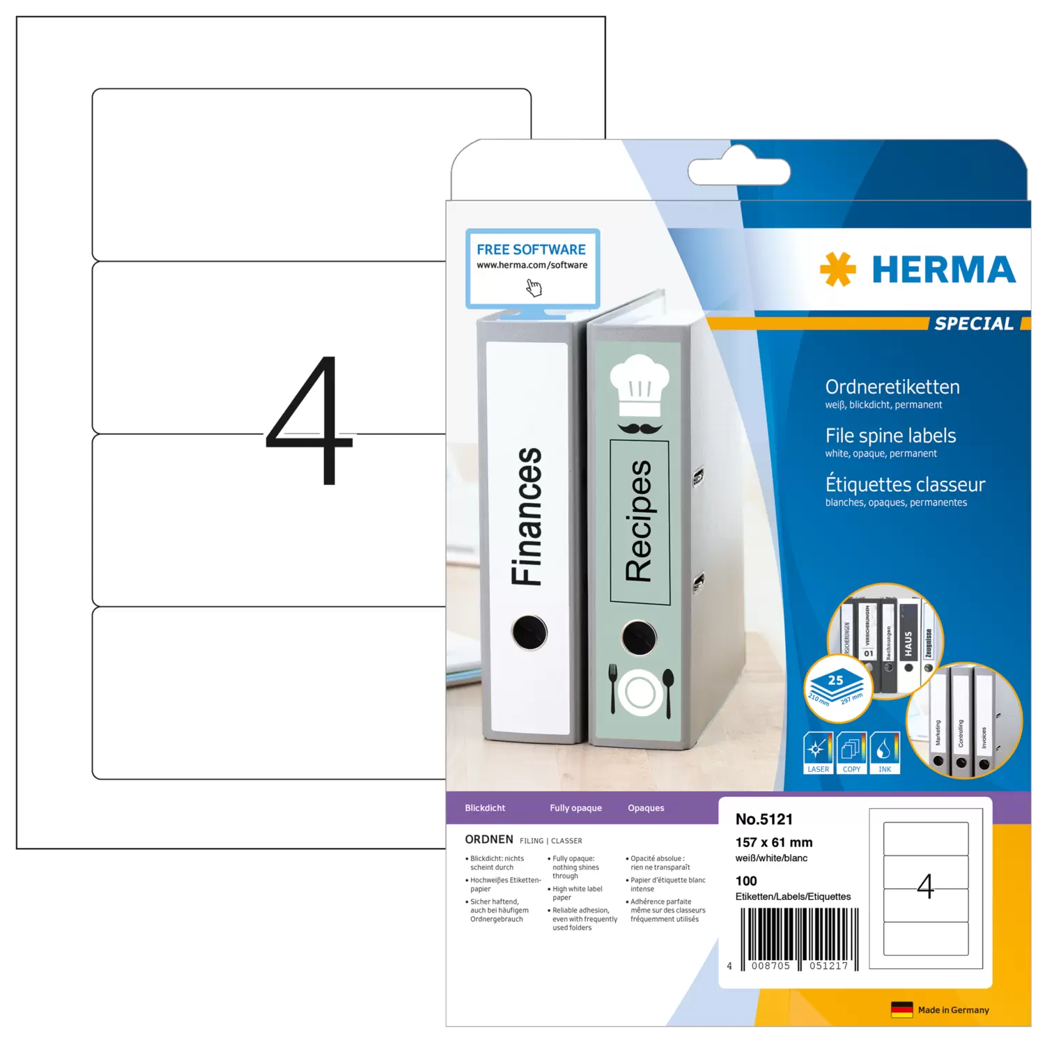 Ordneretiketten, op A4-vellen, zelfklevend. Voor een uniform uiterlijk op kantoor en thuis. Geschikt voor alle gangbare ordners. Absoluut ondoorzichtig materiaal met een hoge witheidsgraad, oude ordneropschriften schijnen niet door. Blanco: ideaal voor bedrijfslogo, opschriften en ordneraantekeningen. Goed hechtend ook bij veelvuldig gebruik van de ordner. Milieuvriendelijk: hoogwaardig, chloorvrij gebleekt speciaal papier, FSC® Mix Credit-gecertificeerd, oplosmiddelvrije contactlijm. Etiketten zijn 100 % recyclebaar met het oud papier, verpakking van gerecycled karton. Zeer goede drukresultaten op alle laser- en inkjetprinters, kopieerapparaten, kleurenlaserprinters en kleurenkopieerapparaten. Storingvrije verwerking dankzij veiligheidsrand rondom en optimale vlakligging. Gratis softwareoplossingen: www.herma.com/software.