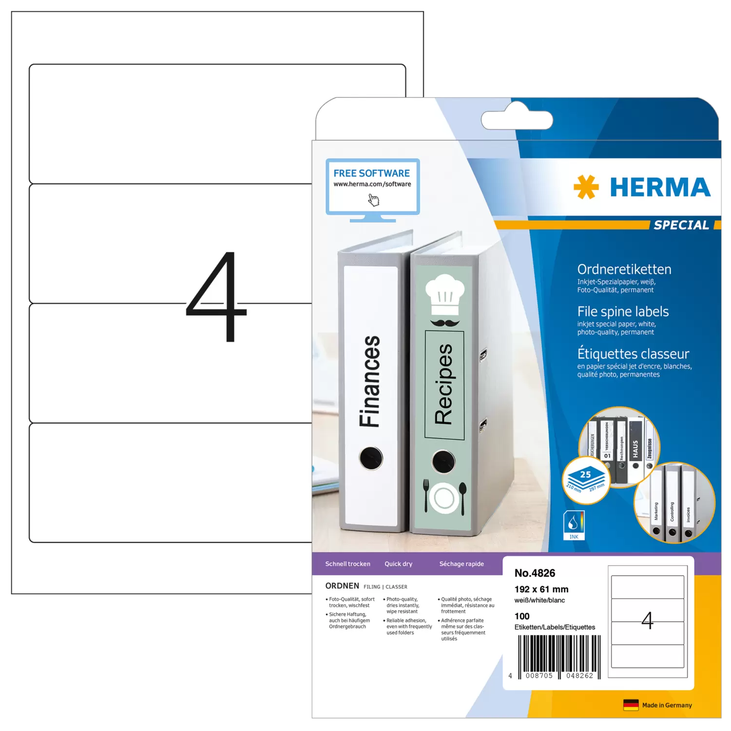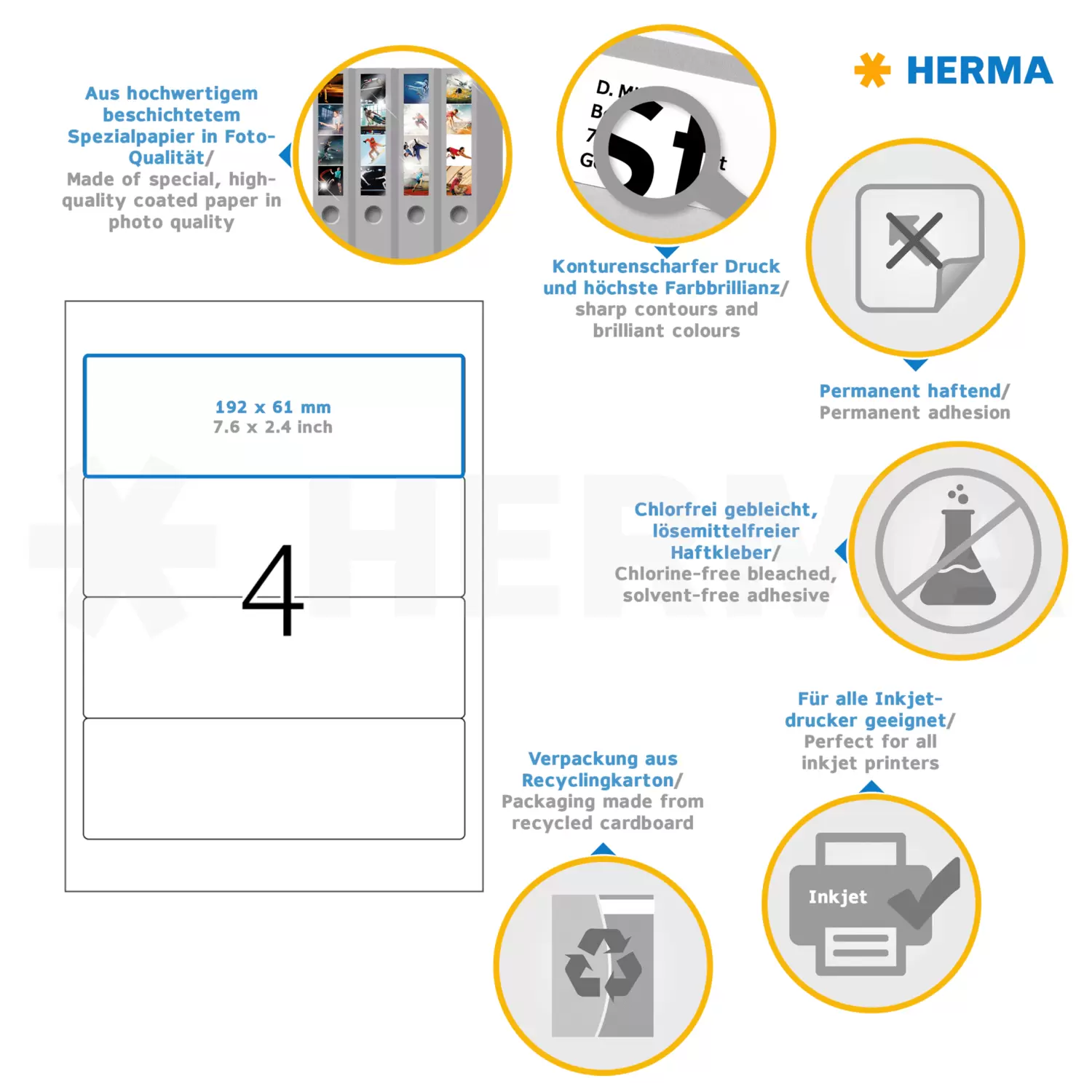 Ordneretiketten, op A4-vellen, zelfklevend. Uitstekende inkjet-prints in zwart/wit en kleur. Van hoogwaardig gestreken speciaal papier, 90 g/m² voor scherpe contouren en afdrukken in schitterende kleuren van foto-kwaliteit. Blanco: ideaal voor bedrijfslogo, opschriften en ordneraantekeningen. Goed hechtend, ook bij veelvuldig gebruik van de ordner. Met rand rondom: over het volledige oppervlak te bedrukken en ideaal ook voor inkjetprinters met kritisch papiertransport. Gratis softwareoplossingen: www.herma.com/software.