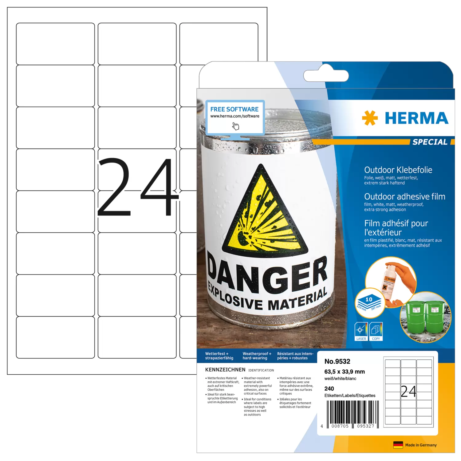 Weervaste etiketten van witte, matte polyethyleenfolie, zelfklevend. Ideaal voor outdoor-toepassingen en etiketten in zwaarbelaste omstandigheden: Eigendomsetiketten, etalagestickers, attentie- en waarschuwingplaatjes, labelen in het magazijn en in de productie. Extreem sterk hechtend, ook op kritische oppervlakken. Weervast, rekbaar, verouderingsbestendig, olie en vuil afstotend, afwasbaar, temperatuurbestendig van -40 tot +150 °C, zeewaterbestendig. Voor laserprinters, kopieerapparaten, kleurenlaserprinters en kleurenkopieerapparaten. Gratis softwareoplossingen: www.herma.com/software.