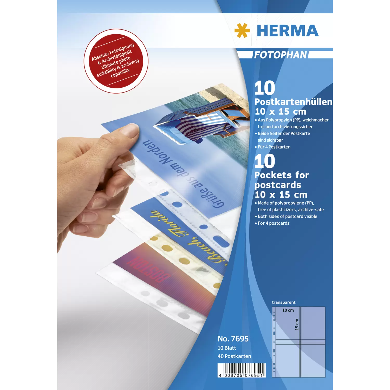 De HERMA ansichtkaartenhoesjes zijn de ideale opbergmogelijkheid voor ansichten in het standaardformaat DIN A6 (10,5 x 14,8 cm). Gewoon in de transparante vakjes steken en meteen is alles goed opgeborgen – ongecompliceerd en helemaal zonder lijmen! De hoesjes zijn gemaakt van stevig transparant polypropyleen met opgesealde steekvakjes, zodat er per hoesje tot vier ansichtkaarten ingestoken kunnen worden en beide zijden zichtbaar blijven. De hoesjes zijn absoluut weekmakervrij en archiveringsbestendig, zonder chemische inwerking op de ansichtkaarten. Elke verpakking bevat 10 hoesjes met plek voor 40 ansichtkaarten. Dankzij de praktische europerforatie kunnen ze in alle gangbare ordners, albums en ringbanden voor DIN A4-formaten worden opgeborgen. Ideaal zijn de HERMA Fotobooks, verkrijgbaar in 5 prachtige kleuren. Perfecte bescherming, absoluut vrij van vuil, vouwen of vingerafdrukken.