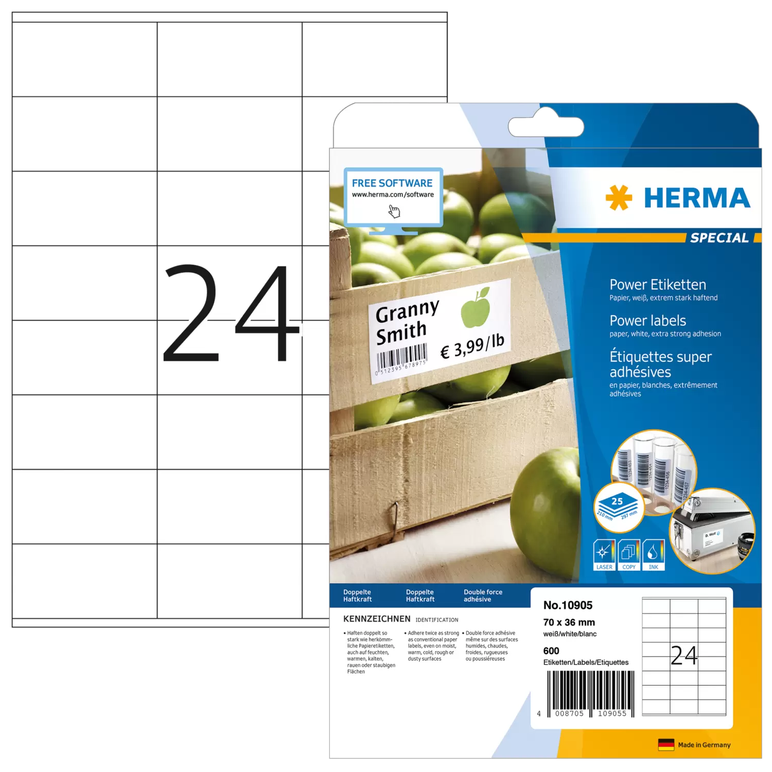 Extreem sterk hechtende etiketten op A4-vellen, zelfklevend. Hechten dubbel zo sterk als traditionele papieren etiketten, ook op een kritische ondergrond, bijv. vochtige, warme, koude, ruwe of stoffige oppervlakken. Ideaal voor het effectief labelen van producten, documenten en inventaris, voor veiligheidsrichtlijnen en waarschuwingen, voor rondom plakken, als keuringsetiket of als sluitetiket, voor binnen. Milieuvriendelijk: hoogwaardig, chloorvrij gebleekt speciaal papier, FSC® Mix Credit-gecertificeerd, oplosmiddelvrije contactlijm. Etiketten zijn 100 % recyclebaar via het oud papier, verpakking van gerecycled karton. Zeer goede drukresultaten op alle laser- en inkjetprinters, kopieerapparaten, kleurenlaserprinters en kleurenkopieerapparaten. Storingvrije verwerking dankzij veiligheidsrand rondom en optimale vlakligging. Gratis softwareoplossingen: www.herma.com/software.