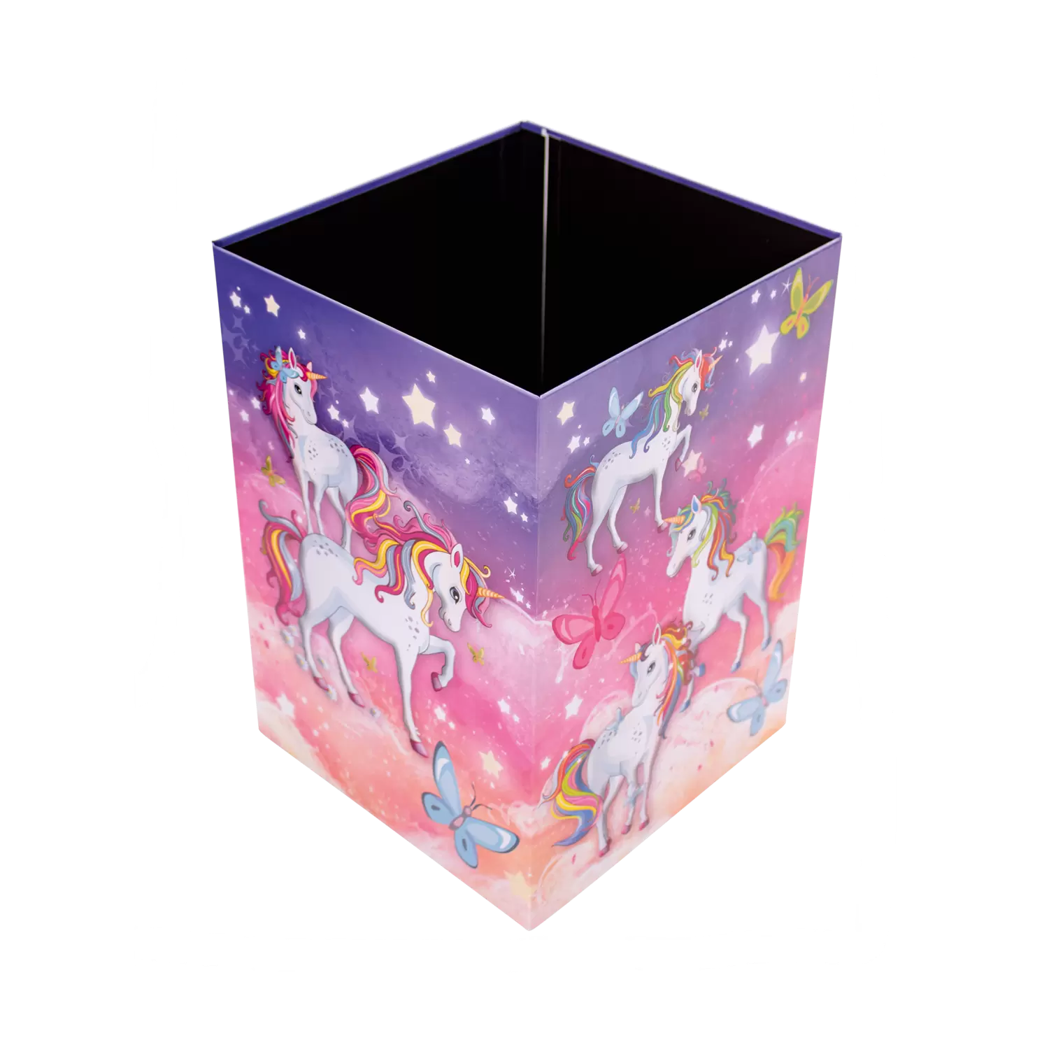 Eenhoorns zijn gewoon superschattig – van deze fabeldiertjes zijn zowel meisjes als jongens in de ban. Deze prachtig in zachte lila- en rosétinten uitgevoerde prullenmand is een geheid succes bij alle eenhoornfans! Praktisch en een lust voor het oog, een echte blikvanger onder het kinderbureautje. De prullenmand is gemaakt van stevig karton en heeft een inhoud van 15 liter, zodat hij onder elk bureautje past. Dankzij het gecoate oppervlak is hij afveegbaar en gemakkelijk schoon te maken. Organiseren gemakkelijk gemaakt, ook in de kinderkamer. Met HERMA. Ontdek de producten van de populaire eenhoornserie: verzamelmappen, thema-ordners, schrijfonderleggers, stickers en meer! Liefdevol gemaakt, populair bij jongens en meisjes – een highlight in de kinderkamer.
