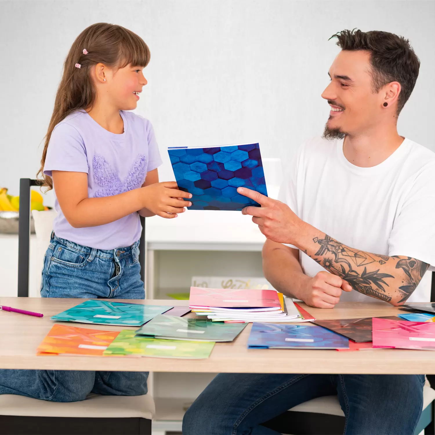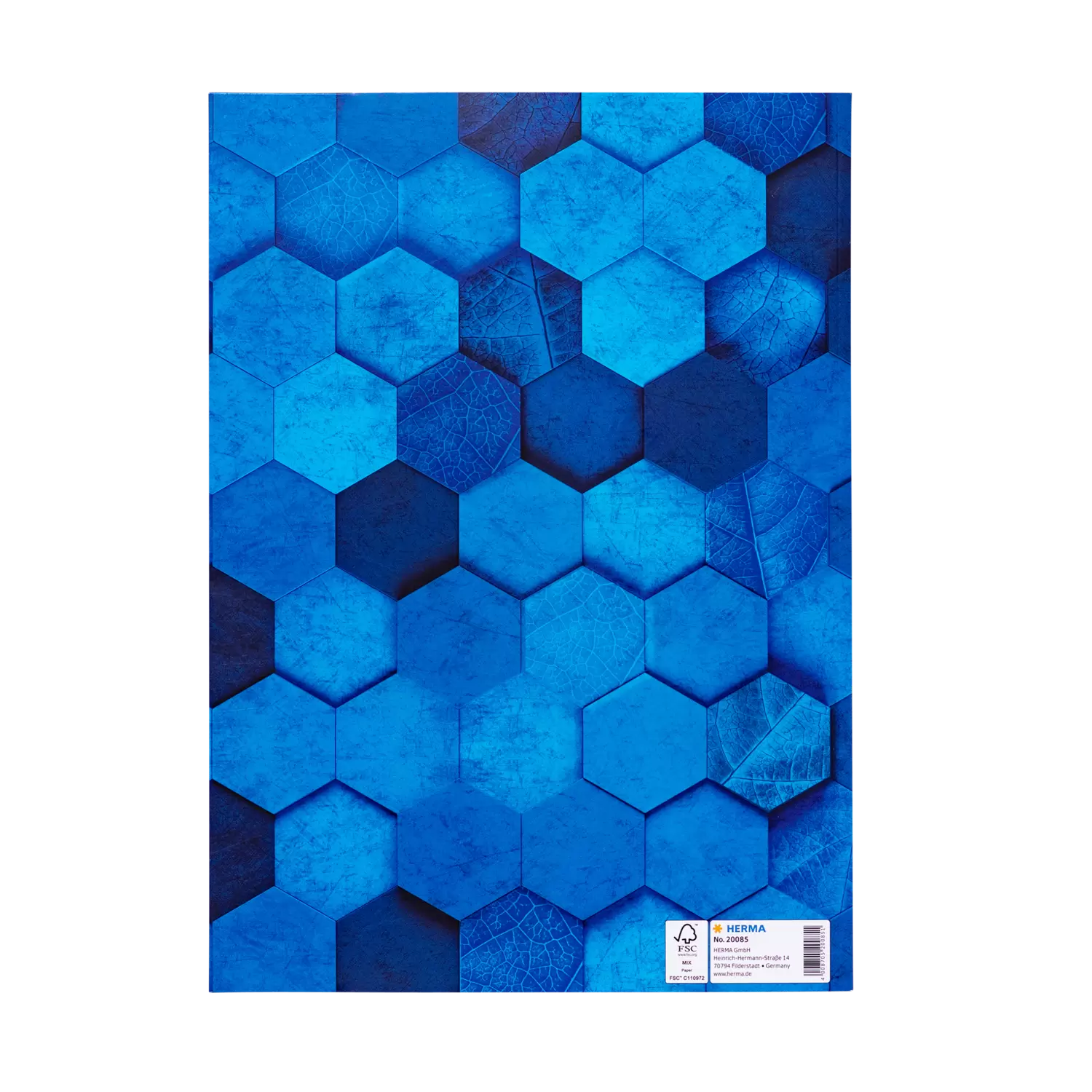 De HERMA kaft X van robuust karton is uniek en mysterieus. Staat de fraai gestileerde X aan de voorkant voor de variabele in de wiskunde, als code voor een geheim, voor het creatieve element, of als onbekende voor de inhoud van het te beschermen schrift of boekje? De kaft van de serie X is niet alleen maar een simpele beschermhoes, maar ook de toegang tot een wereld vol avonturen en geheimen, mystiek en divers. Deze donkerblauwe kaft X heeft het formaat DIN A4 en is versierd met kunstige hexagonen, die gevuld zijn met fijne bladstructuren en zo een fascinerende organische structuur creëren. De uitstraling van het coole design met de fraai gestileerde X ontketent je creativiteit en helpt je gedachten spelenderwijs op papier te zetten. Of het nu op school is, tijdens de studie of in de vrije tijd – deze kaft is de perfecte uitkomst voor iedereen die op zoek is naar iets bijzonders: De nieuwe serie X.