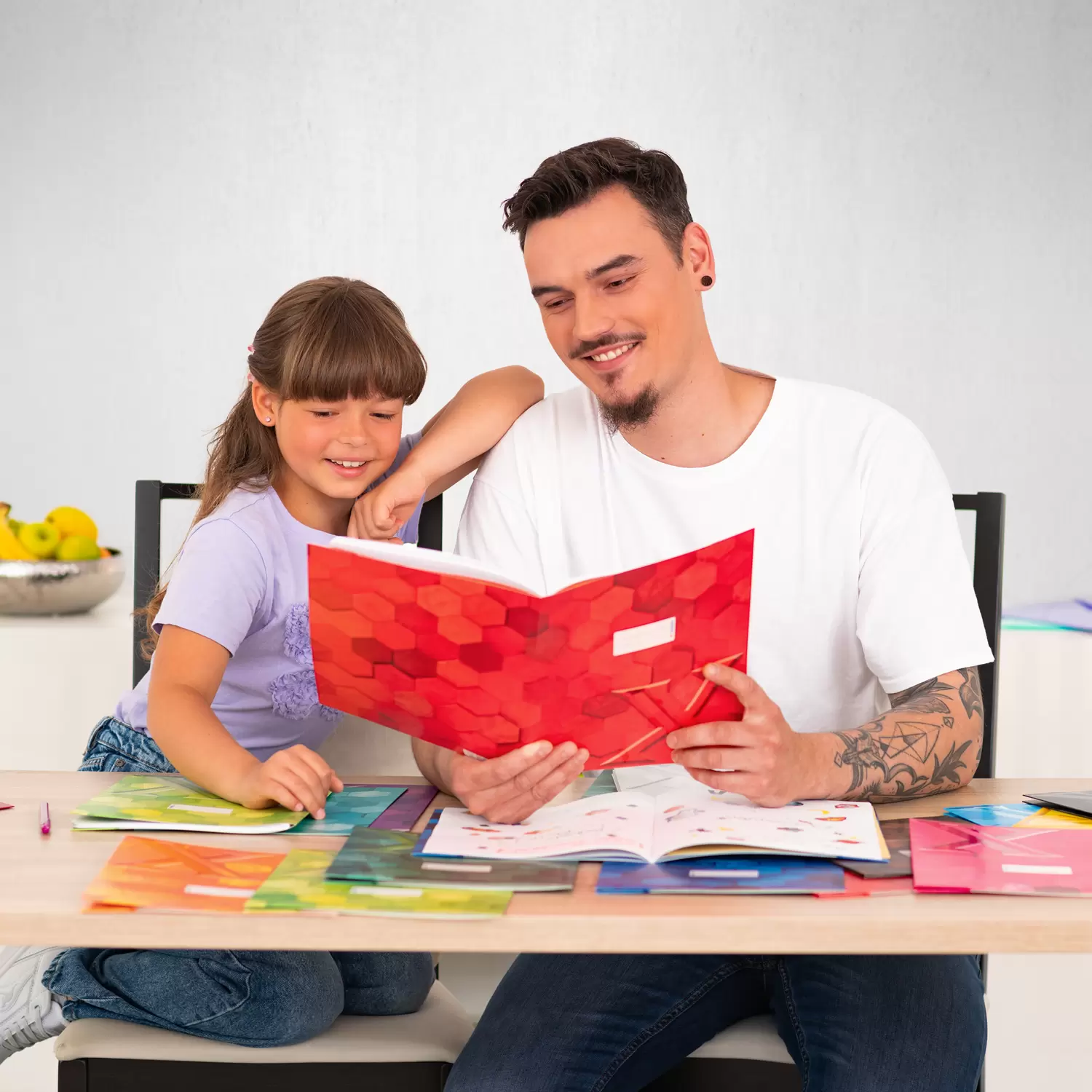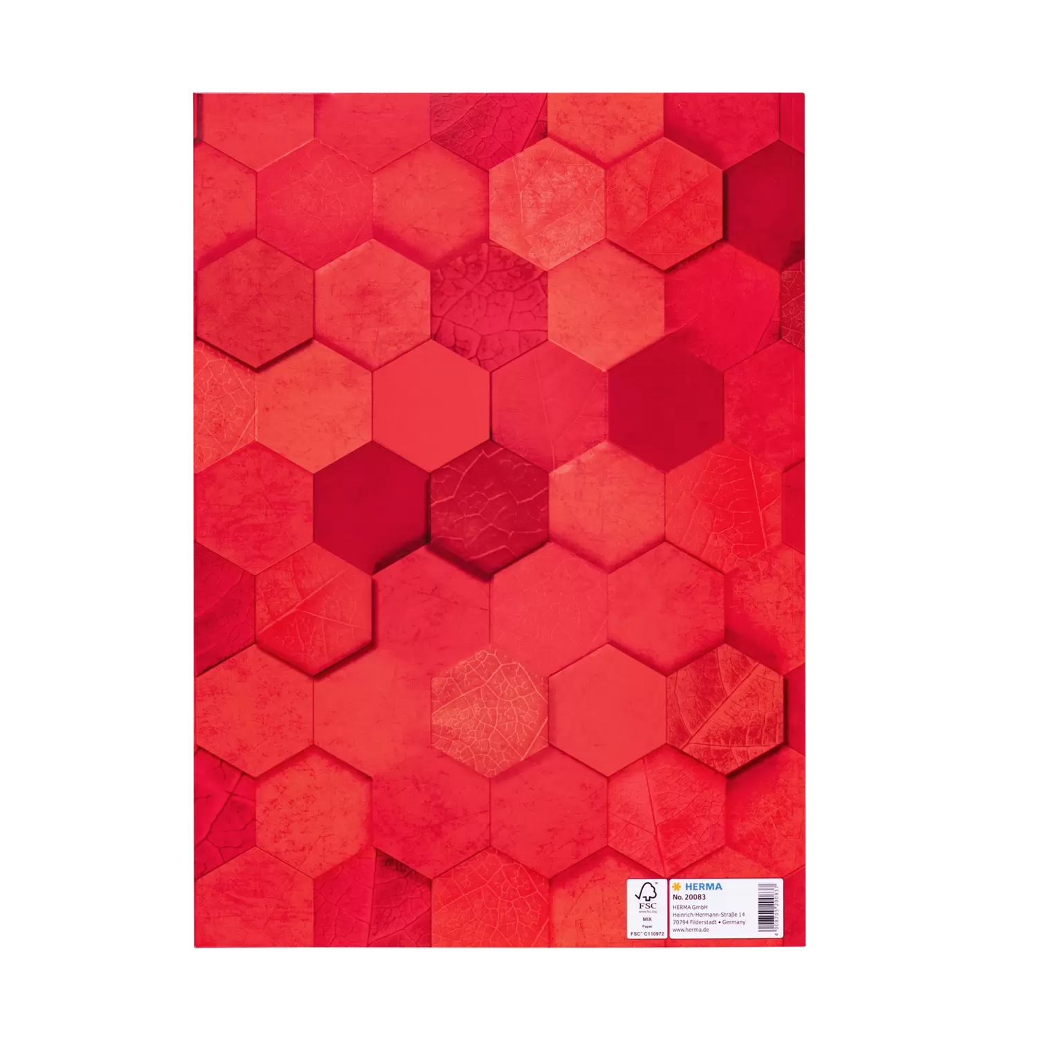De HERMA kaft X van robuust karton is uniek en mysterieus. Staat de fraai gestileerde X aan de voorkant voor de variabele in de wiskunde, als code voor een geheim, voor het creatieve element, of als onbekende voor de inhoud van het te beschermen schrift of boekje? De kaft van de serie X is niet alleen maar een simpele beschermhoes, maar ook de toegang tot een wereld vol avonturen en geheimen, mystiek en divers. Deze rode kaft X heeft het formaat DIN A4 en is versierd met kunstige hexagonen, die gevuld zijn met fijne bladstructuren en zo een fascinerende organische structuur creëren. De uitstraling van het coole design met de fraai gestileerde X ontketent je creativiteit en helpt je gedachten spelenderwijs op papier te zetten. Of het nu op school is, tijdens de studie of in de vrije tijd – deze kaft is de perfecte uitkomst voor iedereen die op zoek is naar iets bijzonders: De nieuwe serie X.