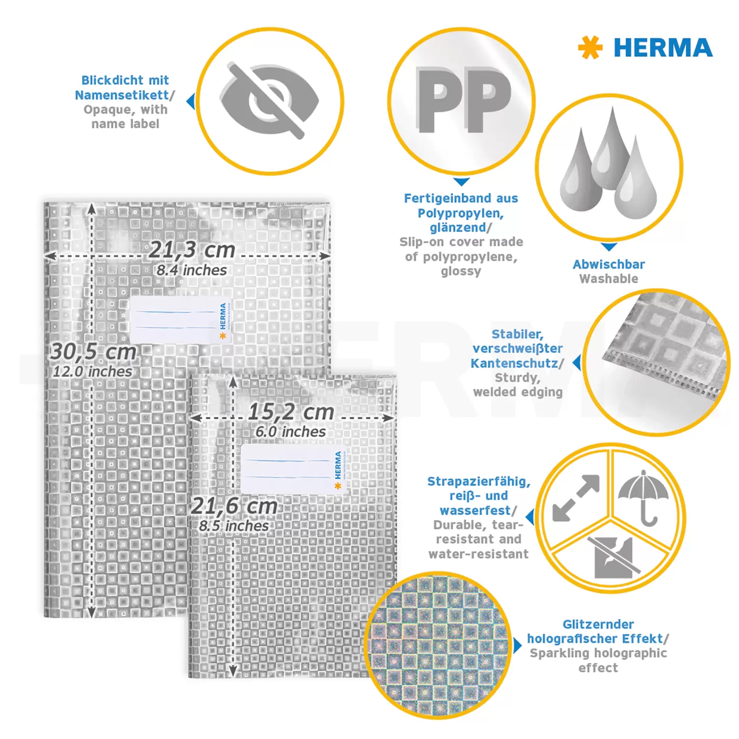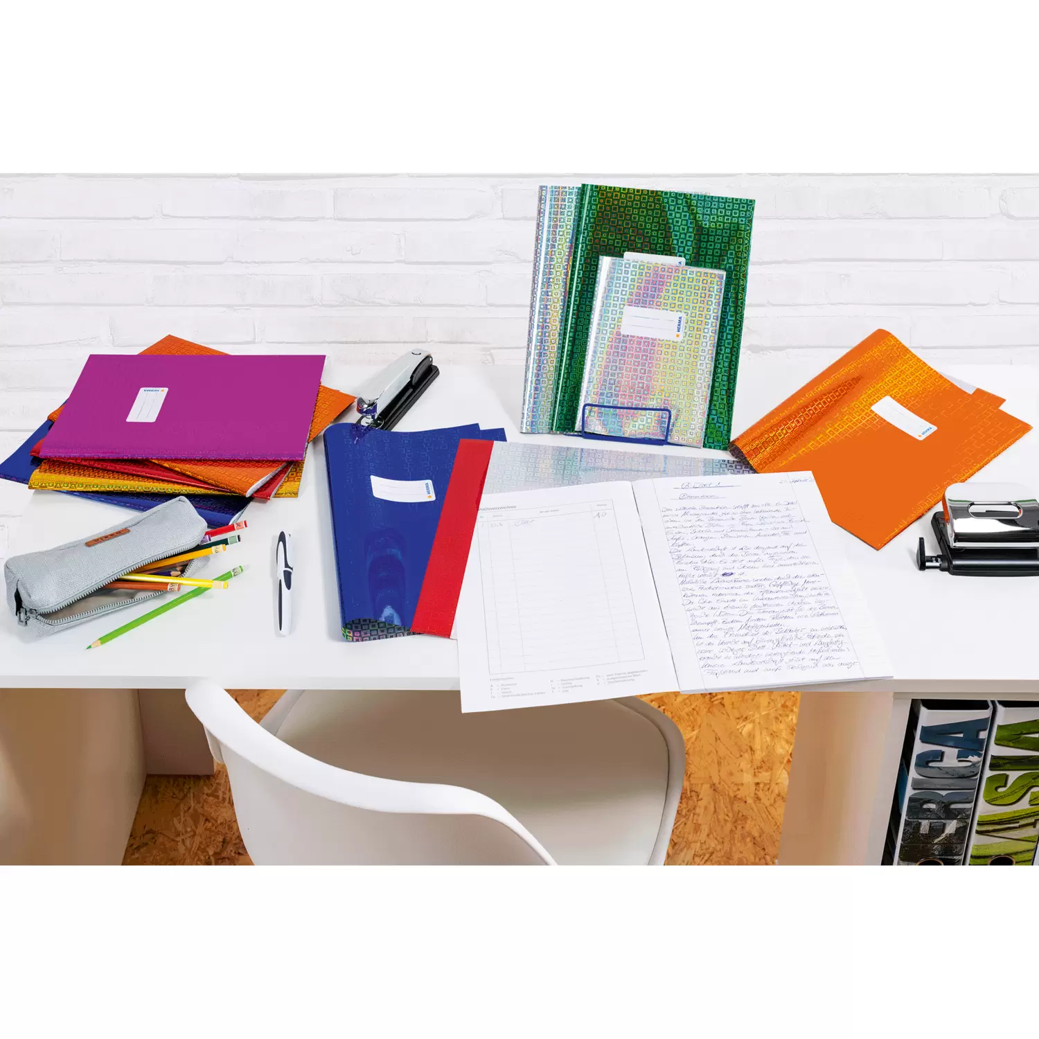 De combinatie van functionaliteit met een vleugje magie maakt deze geraffineerde schriftkaft heel bijzonder. Lijkt de beschermhoes op het eerste gezicht alleen nog zilverkleurig te zijn. Dat verandert als de omslag in het licht wordt gehouden, dan glinstert het oppervlak van holografische glansfolie in bonte regenboogkleuren. Daardoor komt ook het filigraine, fijne ruitjespatroon tot zijn recht. Als de beschermkaft in het licht iets wordt bewogen, ziet u hoe kleuren en licht met elkaar spelen en veranderen. De omslag voor schriften wordt een ware blikvanger op school en universiteit en weet de aandacht van iedereen te trekken. Alle papieren, documentatiemateriaal, rekenboekjes, schrijf- en andere schoolschriften in DIN A4-formaat zijn door de omslag prima beschermd tegen stof, vlekken en beschadiging. Het materiaal polypropyleen is een uiterst robuuste en stevige kunststof die de schriften en boekjes gegarandeerd lang en effectief zal beschermen. Op het praktische beschrijfbare etiket aan de voorkant kan individuele informatie zoals naam, klas of het lesvak worden geschreven. Daardoor is op het eerste gezicht duidelijk van wie het schrift is, wat de inhoud ervan zal zijn en ook kan het snel worden terugbezorgd bij de eigenaar als het in de school een keertje kwijtraakt.