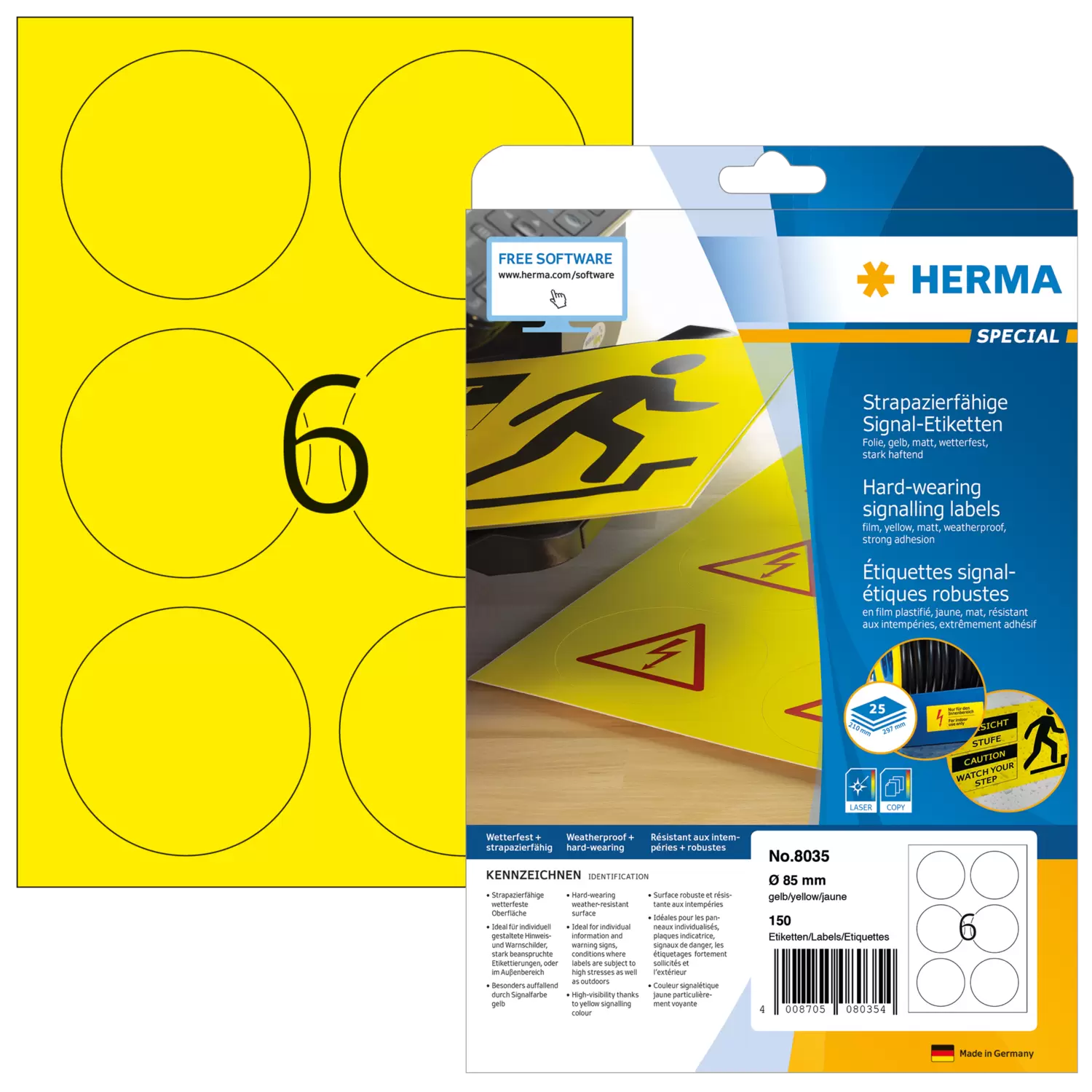 Gele folie-etiketten op A4-vellen, zelfklevend. Ideaal voor etiketten op zwaar belaste plaatsen en buiten: eigendomsetiketten, etalagestickers, attentie- en waarschuwingsplaatjes, labelen in het magazijn en in de productie. Bijzonder opvallend dankzij de signaalkleur geel. Slijt- en weervast oppervlak, zeer sterk hechtend, verouderingsbestendig, olie en vuil afstotend, afwasbaar, temperatuurbestendig van -30 tot 80 °C, zeewaterbestendig. Storingvrije verwerking dankzij veiligheidsrand rondom en optimale vlakligging. Voor laserprinters en kopieerapparaten, kleurenlaserprinters en kleurenkopieerapparaten. Niet geschikt voor inkjetprinters. Gratis softwareoplossingen: www.herma.com/software.