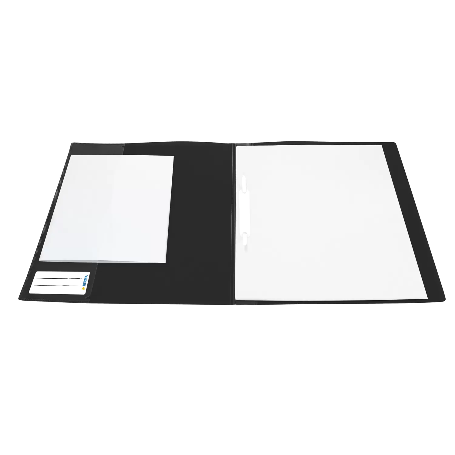 Deze transparante zwarte snelhechter zorgt voor overzicht en orde – of het nu thuis, op kantoor, op school of op de universiteit is. Hiermee kunnen bijvoorbeeld losse vellen papier, belangrijke stukken, nuttige aantekeningen, maar ook zakelijke documenten overzichtelijk geordend en veilig worden meegenomen. Dankzij de transparante voorkant is direct zien welke stukken er zich binnenin de map bevinden. Bovendien is aan de voorkant van de map een opschriftetiket aangebracht, waarop u uw naam of aantekeningen over de inhoud kunt schrijven. Daardoor is snel te zien wat er in de map zit of van wie de zwarte map is. Een andere handige functie is het steekvak dat gebruikt kan worden om vellen papier zonder perforatie in te steken. Dankzij de stevige polypropyleen kaft zijn de documenten in de map goed beschermd tegen vocht, vuil en knikken. Bovendien zorgt de metalen klem ervoor dat de opgeborgen vellen papier stevig en netjes bij elkaar worden gehouden. Alle documenten in DIN A4-formaat met standaard perforatie kunnen in deze lichte en slanke map snel en veilig worden opgeborgen.