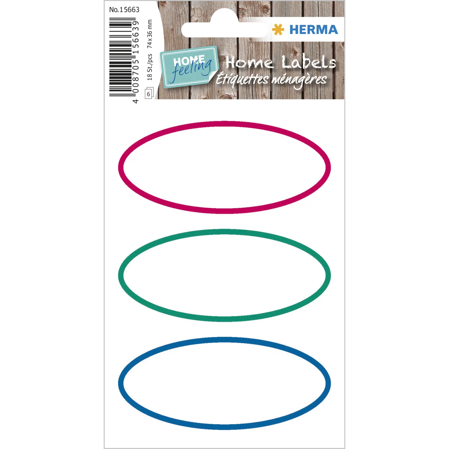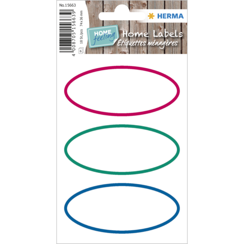 De kleine hulpjes die helpen orde te houden in het huishouden: Van wie is dat? Waar hoort wat thuis? Wat zit daarin? Etiketteren en markeren helpt bij de strijd tegen de dagelijkse chaos in de huishouding, spaart je zenuwen bij het terugvinden van dingen en verfraait bovendien het huis. De praktische zelfklevende etiketten om zelf te beschrijven van HERMA HOME in de kleine handzame verpakking horen thuis in elke rommellade. Zo kunnen kruiden, tupperwarebakjes, voorraden en benodigdheden in de keuken, gereedschappen, dozen, kratten en stellingkasten in de kelder, lades en nog veel meer eenvoudig en overzichtelijk in het hele huis worden geëtiketteerd Elke verpakking bevat 18 ovale, permanent hechtende etiketten met gekleurd kader in rood, groen en blauw in het formaat 76 x 35 mm. Het oppervlak is fijn mat en kan met viltstiften en balpennen uitstekend worden beschreven zonder uit te lopen. De afgeronde hoeken maken het gemakkelijk om de etiketten van het rugpapier te halen en ze naar believen op te plakken. Let op: de etiketten zijn niet geschikt voor het gebruik in printers.