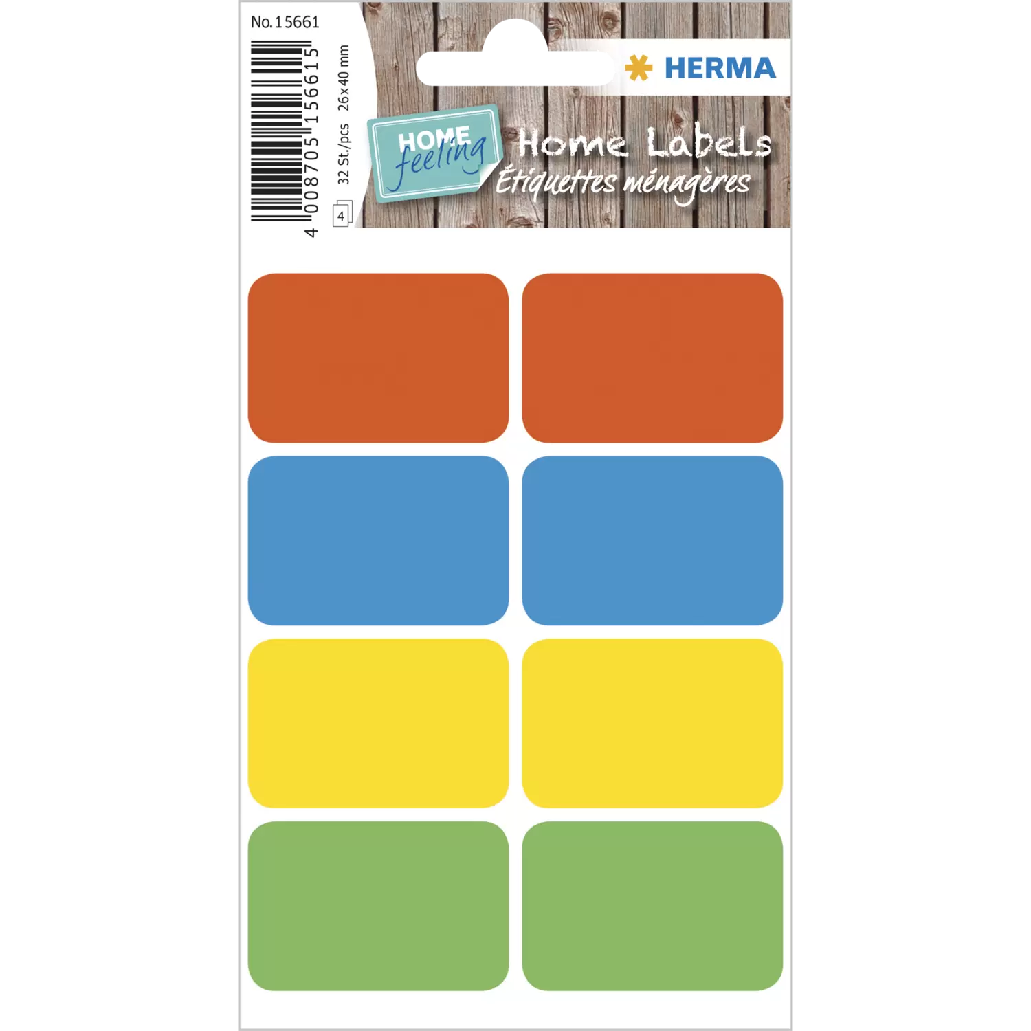 - Gekleurde huishoud-etiketten in rood, blauw, geel en groen, in het formaat 26 x 40 mm, 32 stuks per verpakking
