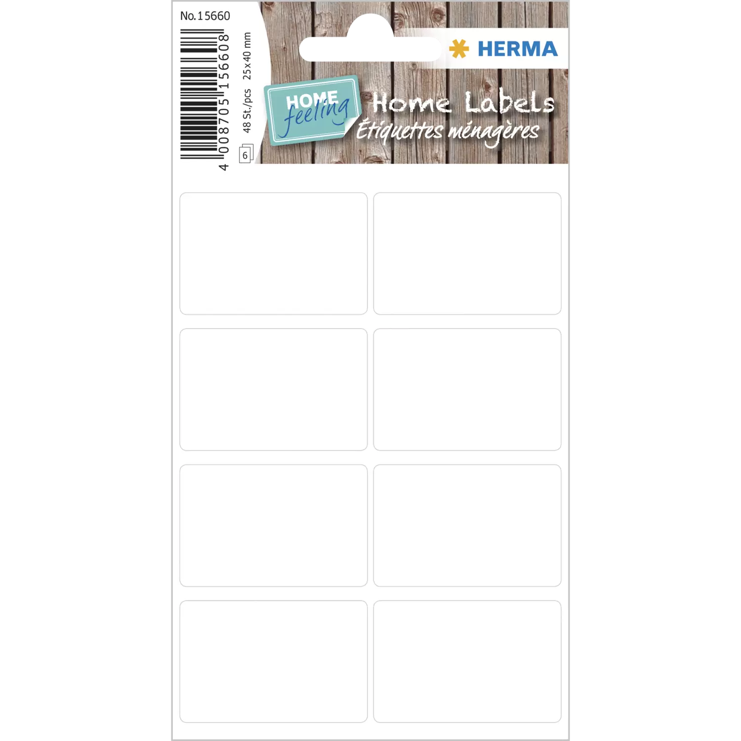 De kleine hulpjes die helpen orde te houden in het huishouden: Van wie is dat? Waar hoort wat thuis? Wat zit daarin? Etiketteren en markeren helpt bij de strijd tegen de dagelijkse chaos in de huishouding, spaart je zenuwen bij het terugvinden van dingen en verfraait bovendien het huis. De praktische zelfklevende etiketten om zelf te beschrijven van HERMA HOME in de kleine handzame verpakking horen thuis in elke rommellade. Zo kunnen kruiden, tupperwarebakjes, voorraden en benodigdheden in de keuken, gereedschappen, dozen, kratten en stellingkasten in de kelder, lades en nog veel meer eenvoudig en overzichtelijk in het hele huis worden geëtiketteerd Elke verpakking bevat 48 witte, permanent hechtende etiketten in het formaat 25 x 40 mm. Het oppervlak is fijn mat en kan met viltstiften en balpennen uitstekend worden beschreven zonder uit te lopen. De afgeronde hoeken maken het gemakkelijk om de etiketten van het rugpapier te halen en ze naar believen op te plakken. Let op: de etiketten zijn niet geschikt voor het gebruik in printers.