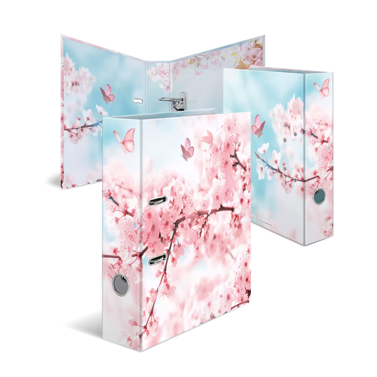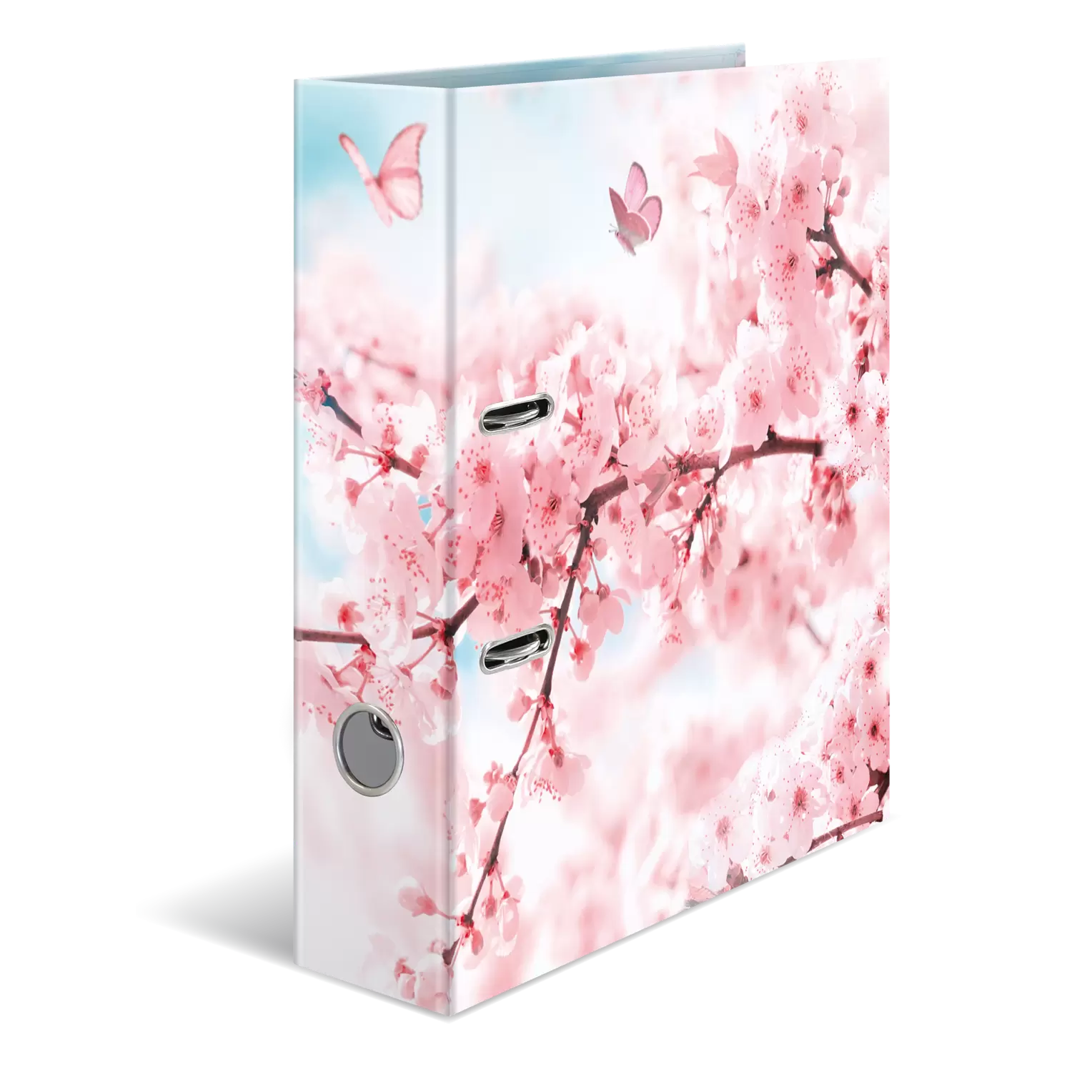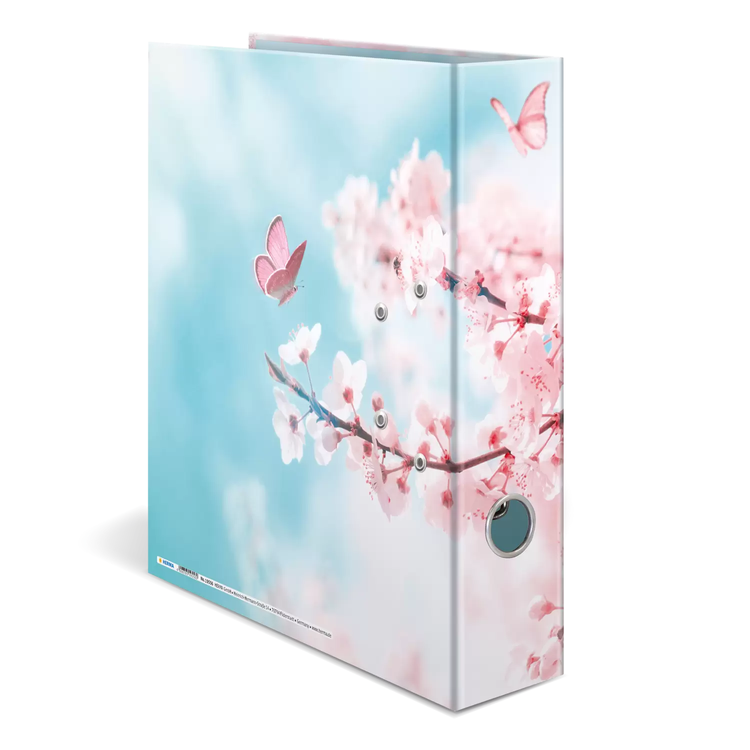 Met de HERMA thema-ordner in het design Cherry Blossom uit de serie 'Flowers' haalt u de kleurenpracht van de bloemenwereld in huis, kantoor of school. Bloemen zijn niet voor niets de koninginnen van de flora: altijd al hebben ze ons gefascineerd. Ze worden omgeven door een zweem van gratie en bekoorlijkheid, waarover alleen florale schoonheden beschikken. Elke soort heeft zijn eigen kleuren, geur en aura, delicaat of sterk, discreet of uitbundig, altijd bijzonder en uniek: een cadeautje vol van kleurrijke diversiteit, een genot voor de zintuigen. Zachtblauw en delicaat roze kersenbloesems met kleine vlinders: een kleurenspel van zeldzame schoonheid, een lust voor het oog en de ziel. Het speciale hefboommechanisme met metalen klem zorgt ervoor dat de inhoud van de ordner netjes en stevig bij elkaar wordt gehouden. De brede rug garandeert dat de ordner stevig staat in de kast en voldoende plek biedt voor talloze documenten in formaten tot DIN A4.