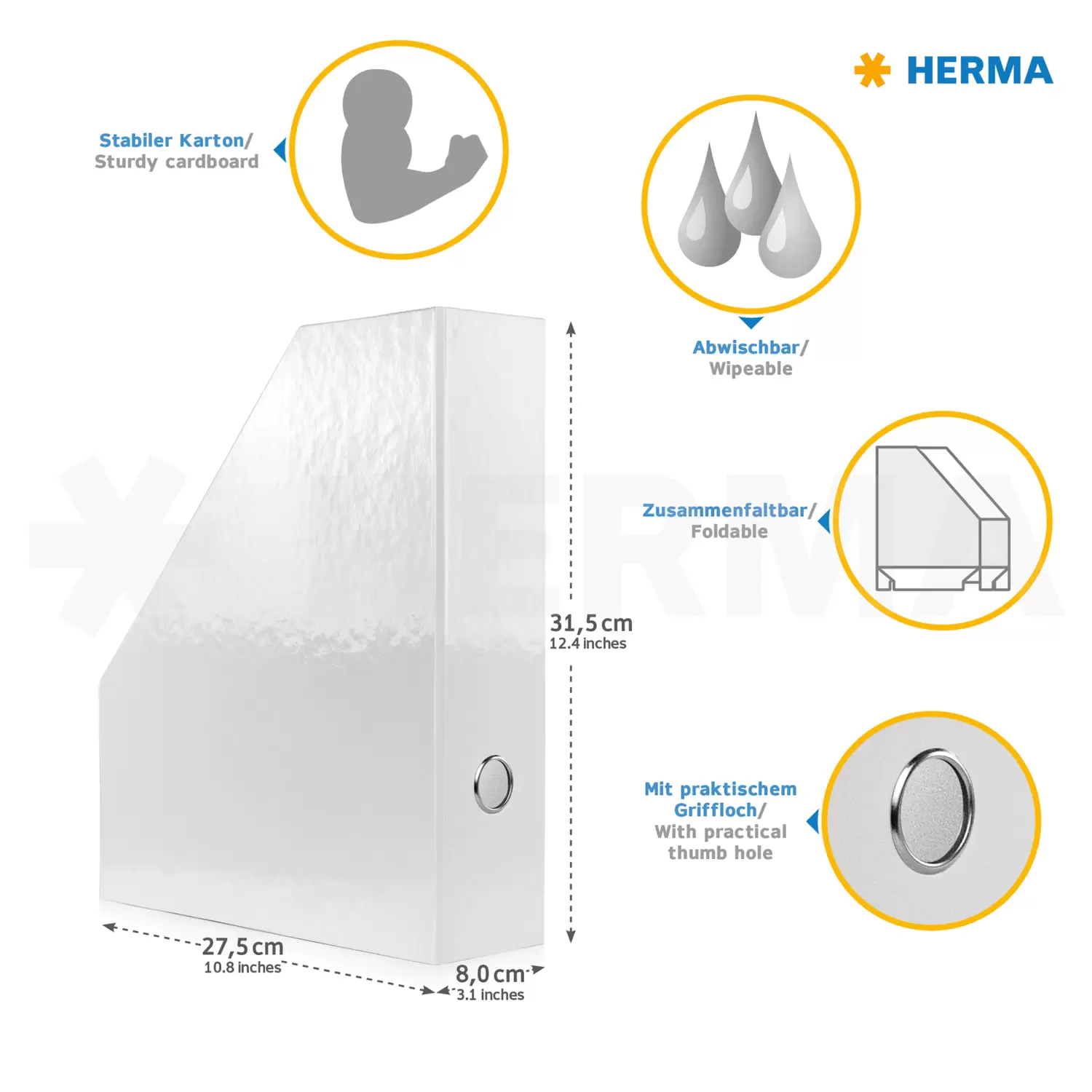 - Tijdschriftenhouder van extra stevig karton, 8 cm breed, 31,5 cm hoog en 27,5 cm diep, passend voor DIN A4-formaten
