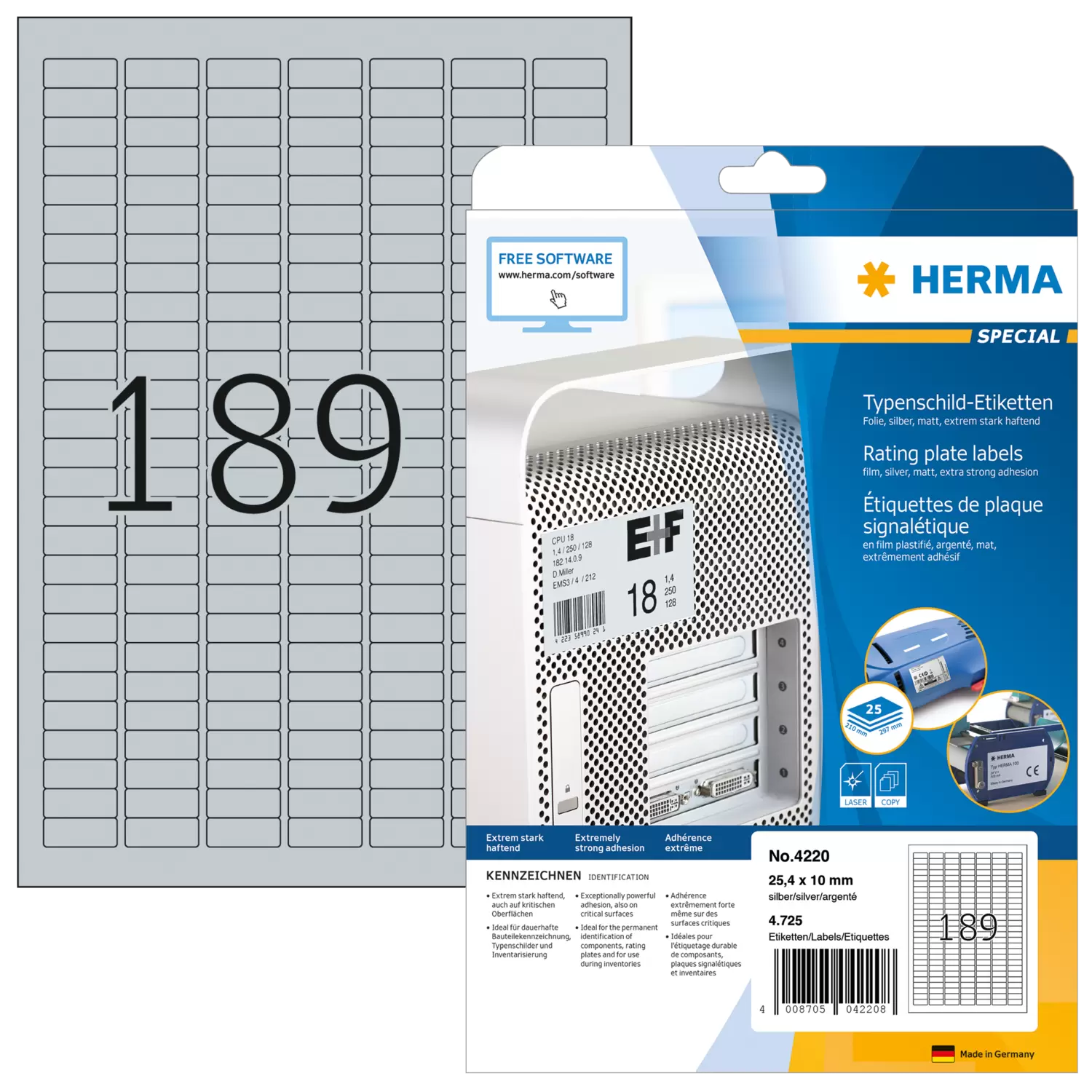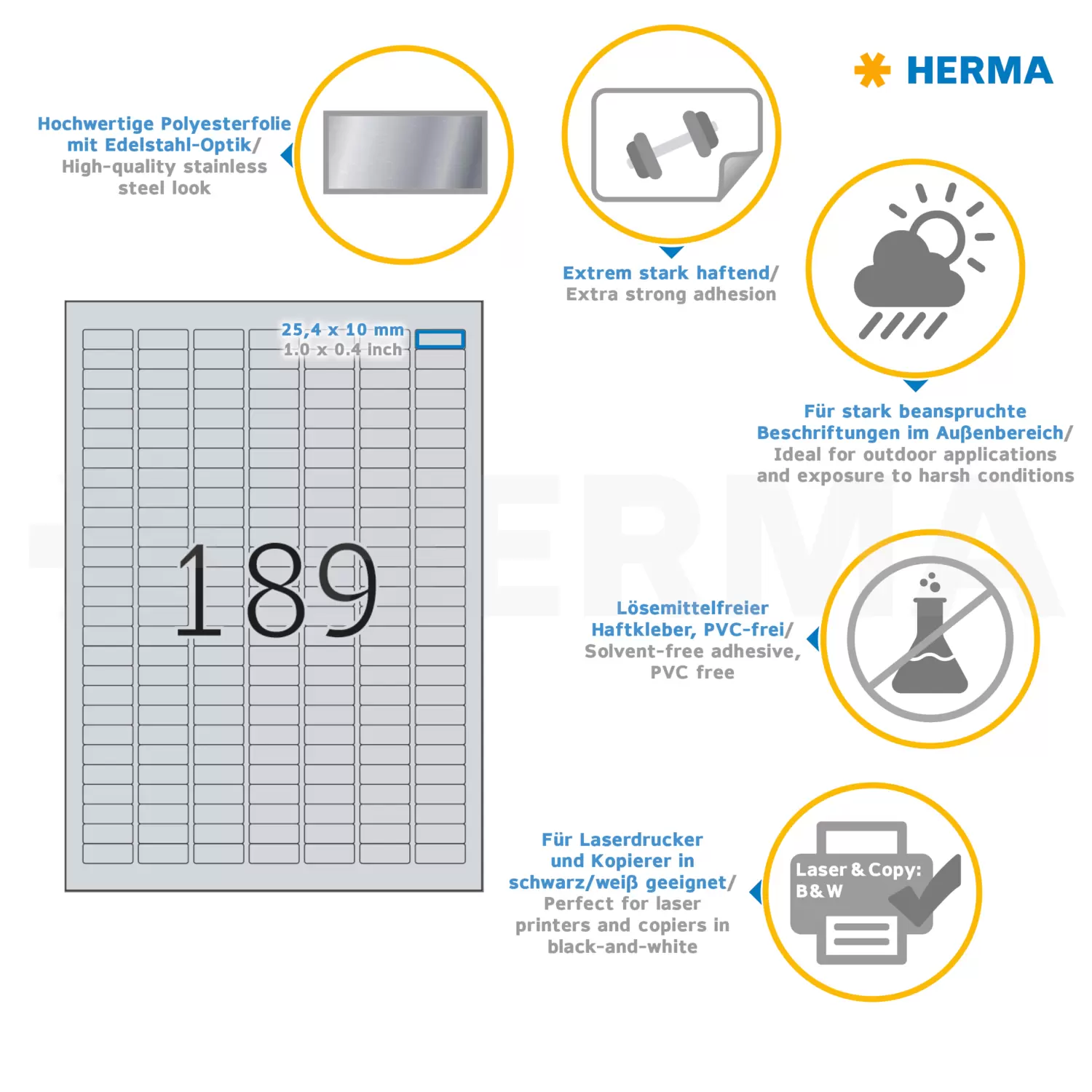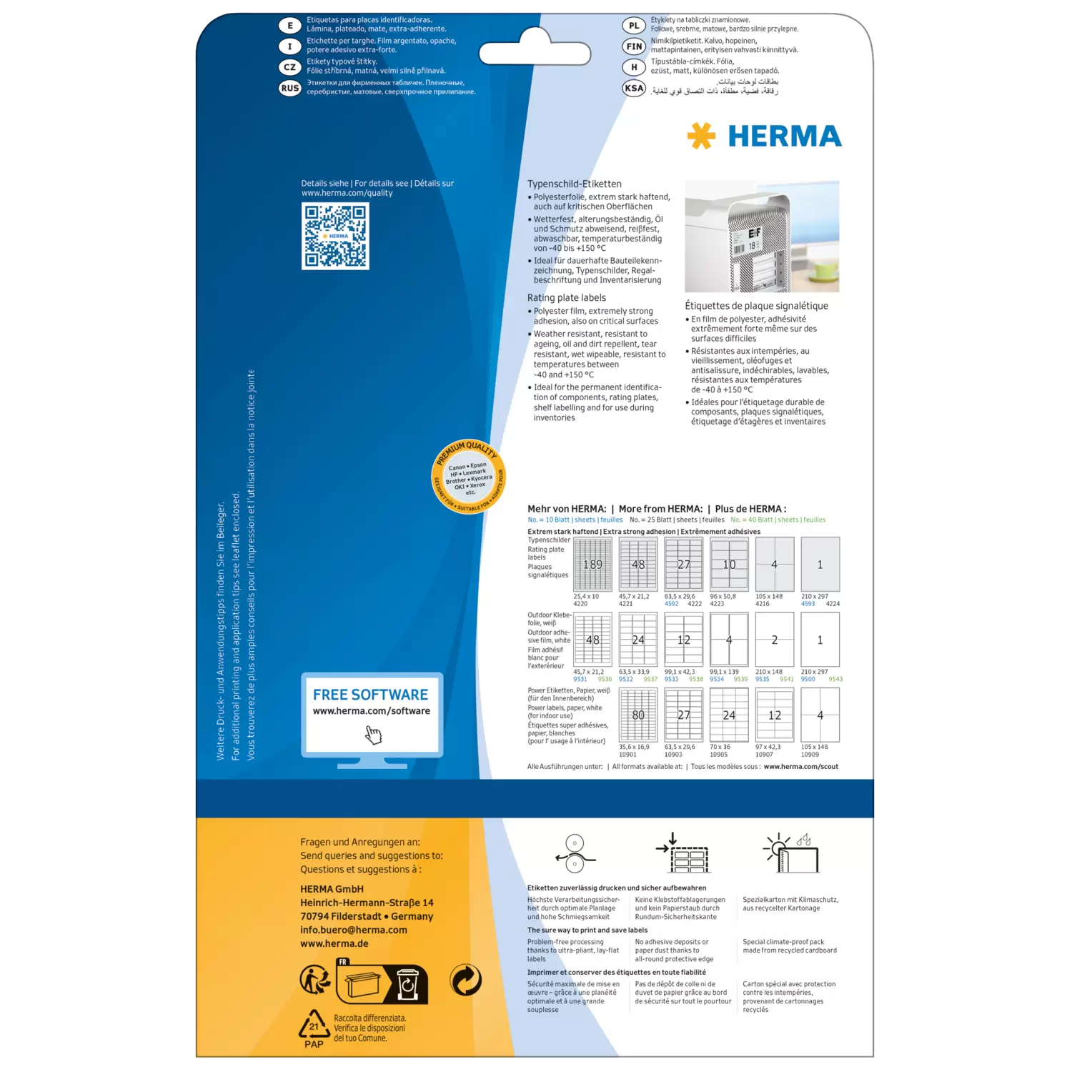 Zilverkleurige oppervlakken van glanzende polyesterfolie, op A4-vellen, zelfklevend. Ideaal voor het duurzaam labelen van onderdelen, als typeplaatjes en voor de inventarisering. Hoogwaardige rvs-look. Weerbestendig, verouderingsbestendig, olie en vuil afstotend, afwasbaar, temperatuurbestendig van -40°C tot +150 °C. Extreem sterk hechtend, ook op ruwe of kritische oppervlakken. Storingvrije verwerking dankzij veiligheidsrand rondom en optimale vlakligging. Voor laserprinters en kopieermachines. Niet geschikt voor inkjetprinters, kleurenlaserprinters en kleurenkopieerapparaten. Gratis softwareoplossingen: www.herma.com/software.