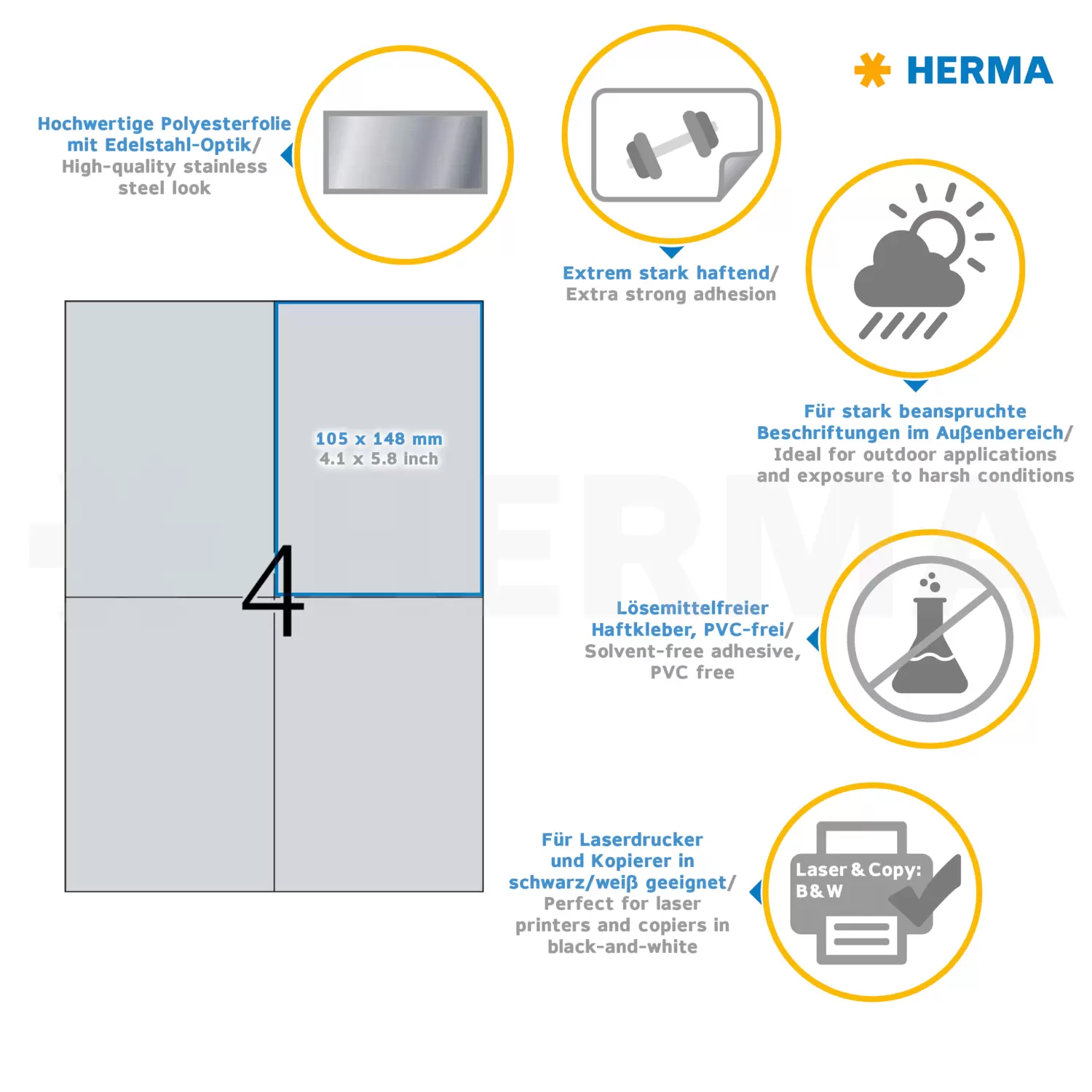 Zilverkleurige oppervlakken van glanzende polyesterfolie, op A4-vellen, zelfklevend. Ideaal voor het duurzaam labelen van onderdelen, als typeplaatjes en voor de inventarisering. Hoogwaardige rvs-look. Weerbestendig, verouderingsbestendig, olie en vuil afstotend, afwasbaar, temperatuurbestendig van -40°C tot +150 °C. Extreem sterk hechtend, ook op ruwe of kritische oppervlakken. Storingvrije verwerking dankzij veiligheidsrand rondom en optimale vlakligging. Voor laserprinters en kopieermachines. Niet geschikt voor inkjetprinters, kleurenlaserprinters en kleurenkopieerapparaten. Gratis softwareoplossingen: www.herma.com/software.