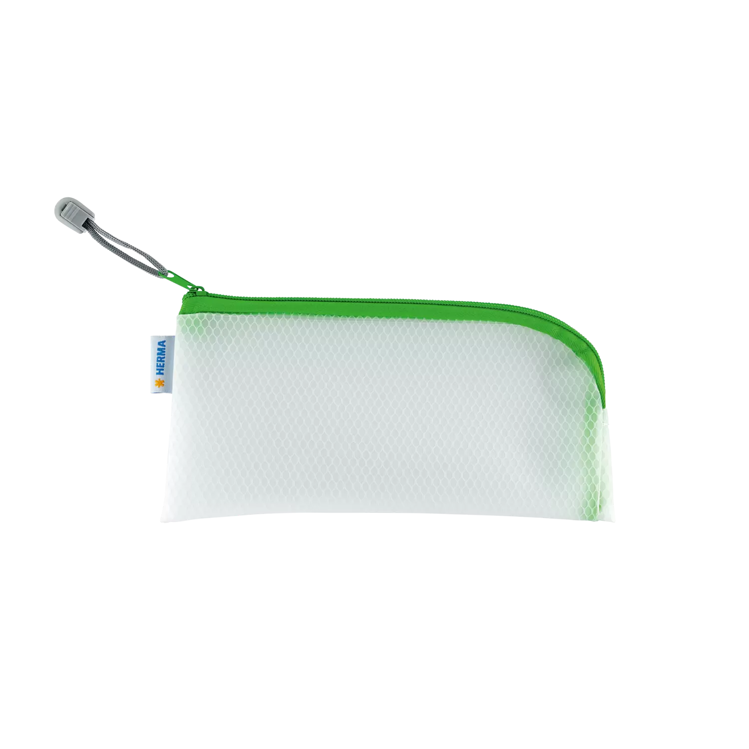 De HERMA universele etui, met groene rand, in het formaat 23 x 11 cm, met praktische ritssluiting aan twee zijden, in de kleuren blauw, rood, geel en oranje. Het halfdoorzichtige mesh-zakje is voor veel doeleinden superhandig: voor verzamelen, sorteren, archiveren. Op reis voor documenten en als necessaire, op kantoor, in de badkamer of de werkplaats – gewoon voor elk bewaardoel. De stevige rasterversterkte en transparante folie biedt zicht op de inhoud en beschermt perfect tegen externe invloeden, zoals verontreinigingen, vuil en vocht. Het materiaal wordt gekenmerkt door zijn bijzondere bestendigheid en is slijtvast. Het opberg- en sorteerwonder is nog in twee andere formaten verkrijgbaar.