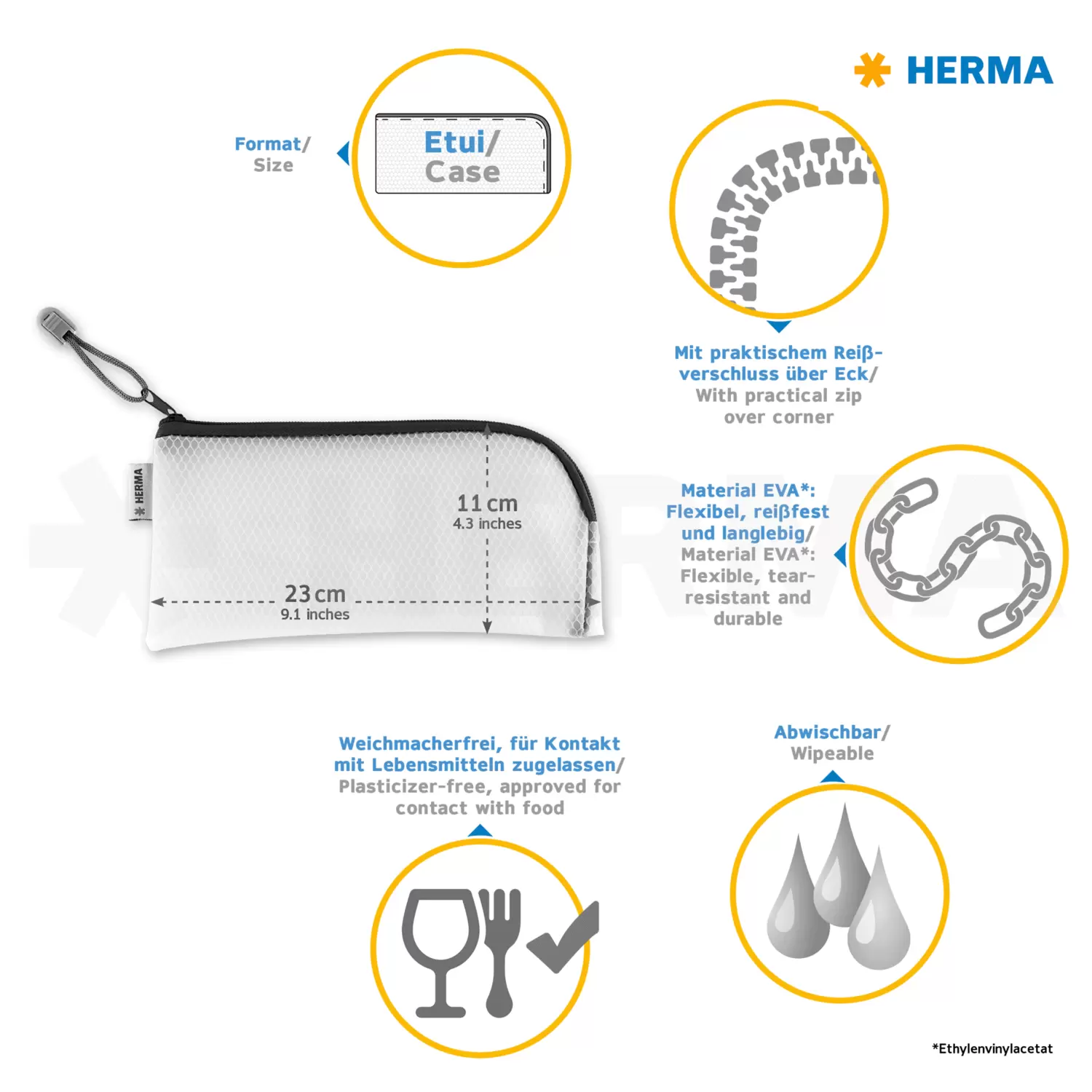 • HERMA universele etui, met praktische ritssluiting, naden met groene rand, 23 x 11 cm.