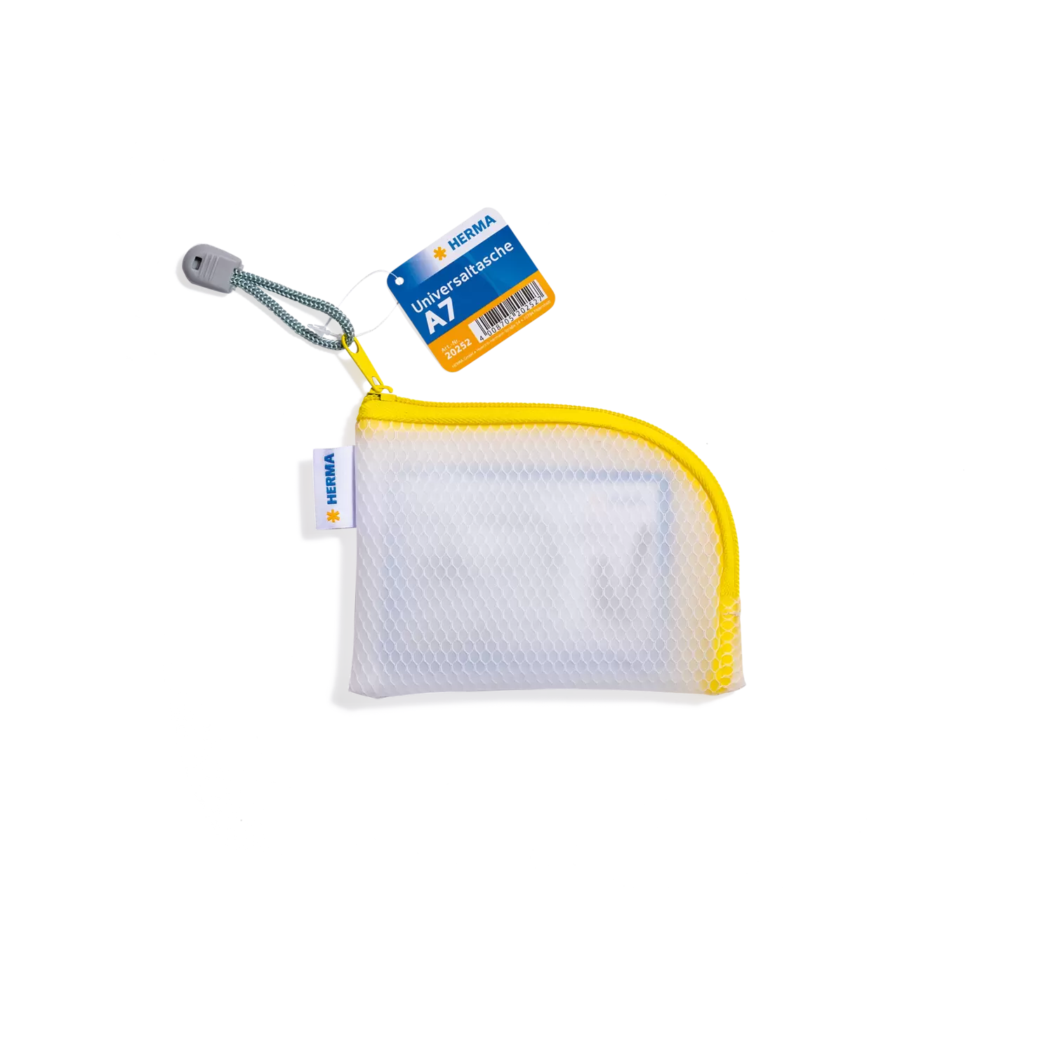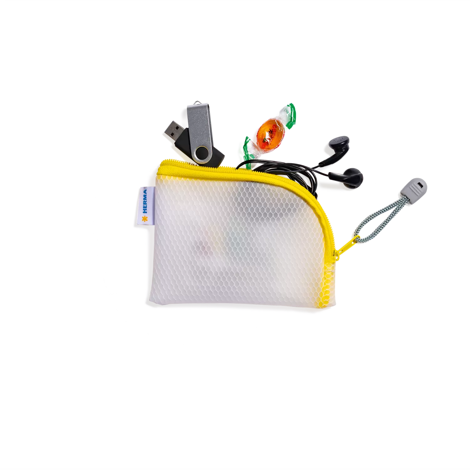 Het HERMA universele mesh-zakje A7, (14 x 10 cm), met praktische hoekritssluiting in de kleur geel. Het halfdoorzichtige mesh-zakje is voor veel doeleinden superhandig: voor sparen, sorteren, archiveren. Op reis voor snuisterijen en als necessaire, op kantoor, in de badkamer of de werkplaats – gewoon voor elk bewaardoel. De stevige rasterversterkte en transparante folie is doorzichtig en beschermt perfect tegen externe invloeden, zoals stof, vuil en vocht. Het materiaal wordt gekenmerkt door zijn bijzondere sterkte en slijtvastheid. De zakjes zijn ideaal voor opbergen en sorteren en zijn in nog twee andere formaten verkrijgbaar.