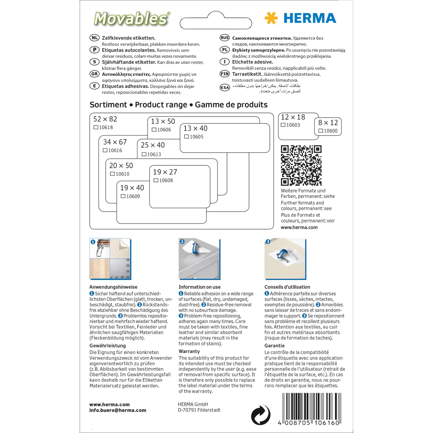 Zelfklevende universele etiketten van hoogwaardig schrijfpapier. Kenmerken en beschrijven - uiterst envoudig, veilig en flexibel. Hechten betrouwbaarop alle gladde, droge, onbeschadigde en stofvrije oppervlakken, kunnen de etiketten worden verwijderd zonder de ondergrond te beschadigen. Ideaal voor deflexibele etikettering en voor oppervlakken die niet beschadigd mogen worden. Milieuvriendelijk: FSC® Mix Credit-gecertificeerd, chloorvrij gebleekt, oplosmiddelvrije contactlijm. Beschrijfbaar met alle schrijfapparaten.