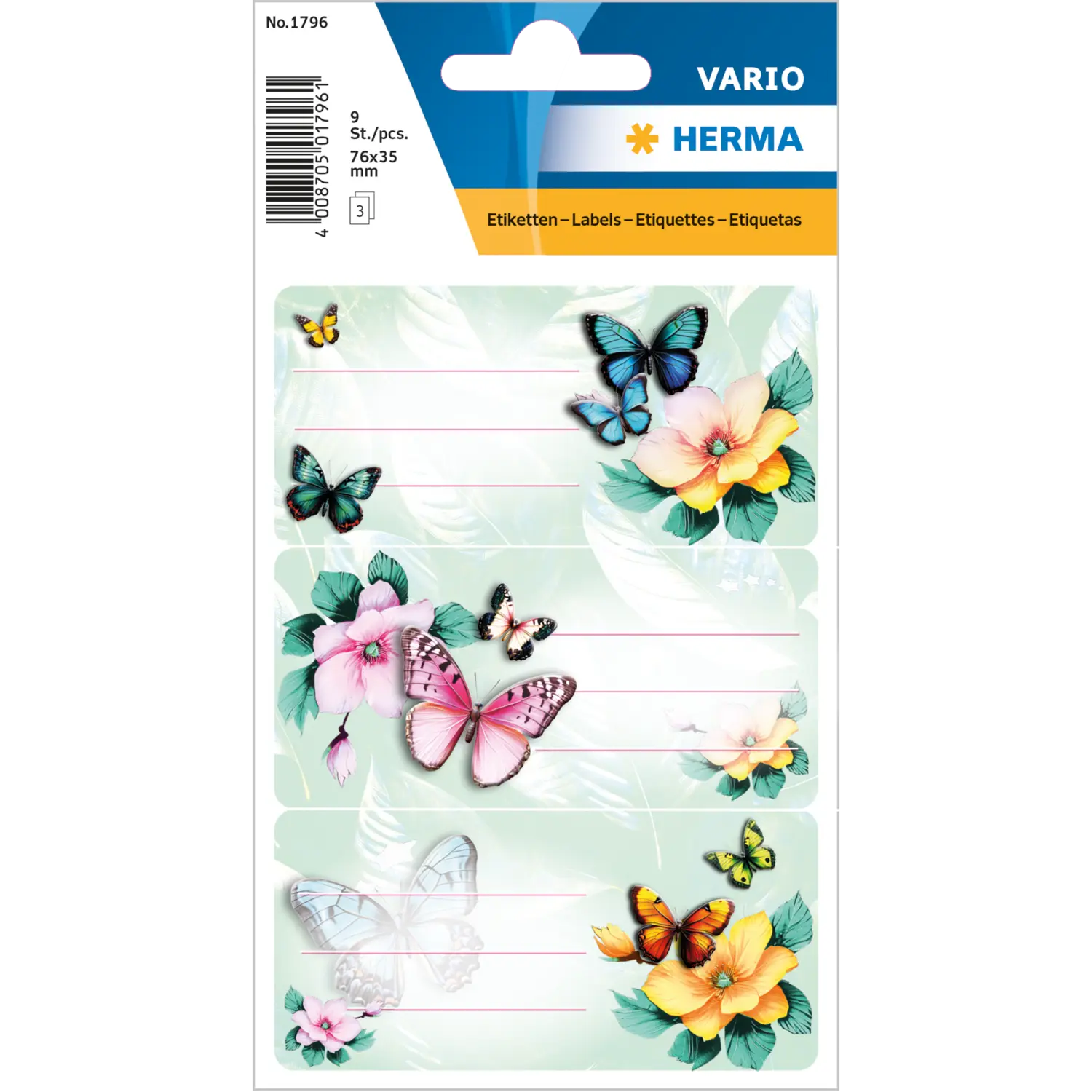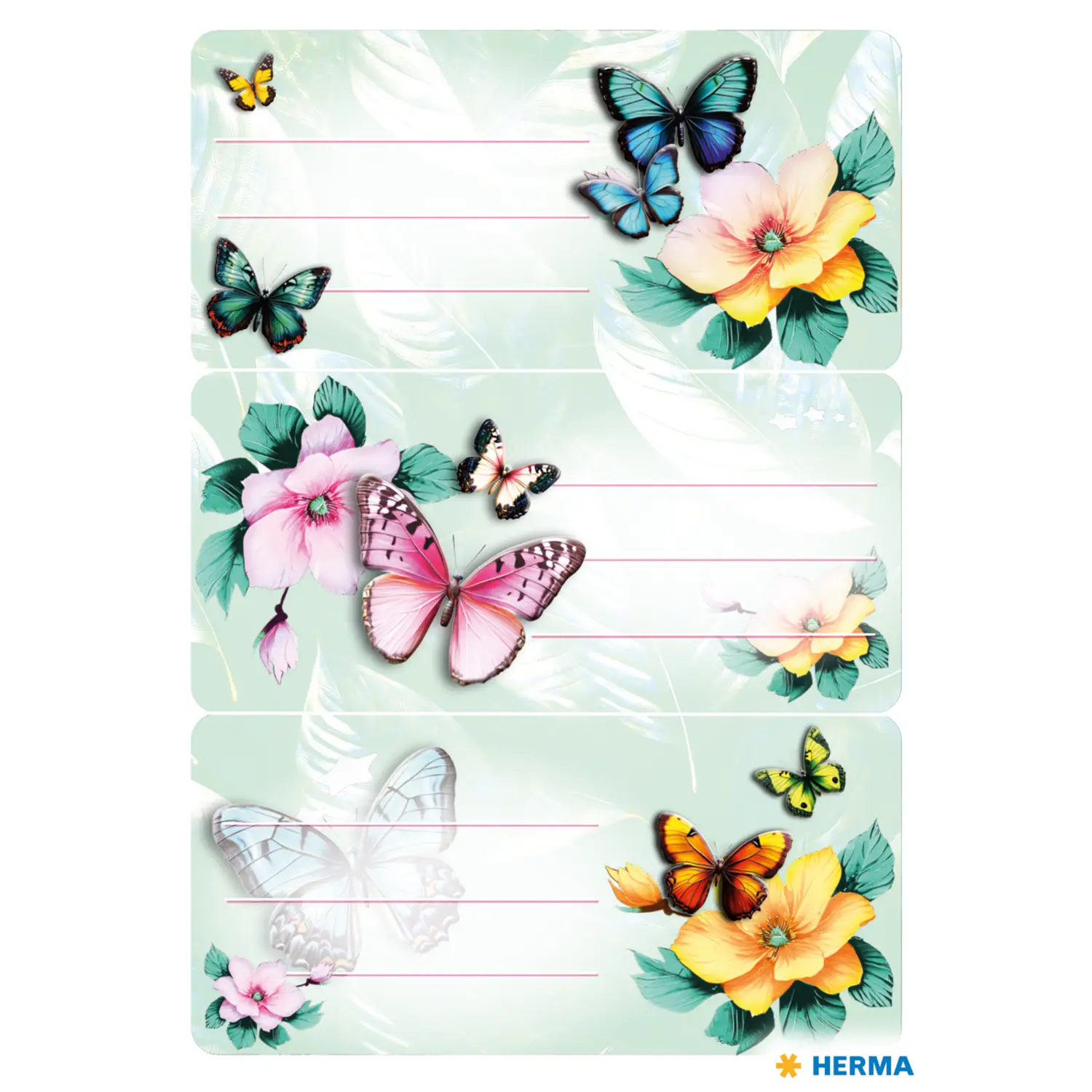 Een vleugje bloemenmagie, pastelkleuren en filigraan vlinders vormen samen een harmonieus geheel: de liefdevol ontworpen schooletiketten in het ontwerp “Vlinders” brengen lichtheid en elegantie in het dagelijkse schoolleven. De praktische etiketten in het formaat 76 x 35 mm zijn gemaakt van hoogwaardig papier, zelfklevend en kunnen moeiteloos met de hand worden beschreven. Verwijderen, plakken en elk boek of schrift is direct onmiskenbaar gemarkeerd. Of het nu op school, op de kleuterschool of in de vriendenkring is: met deze etiketten wordt orde kleurrijk en stijlvol.