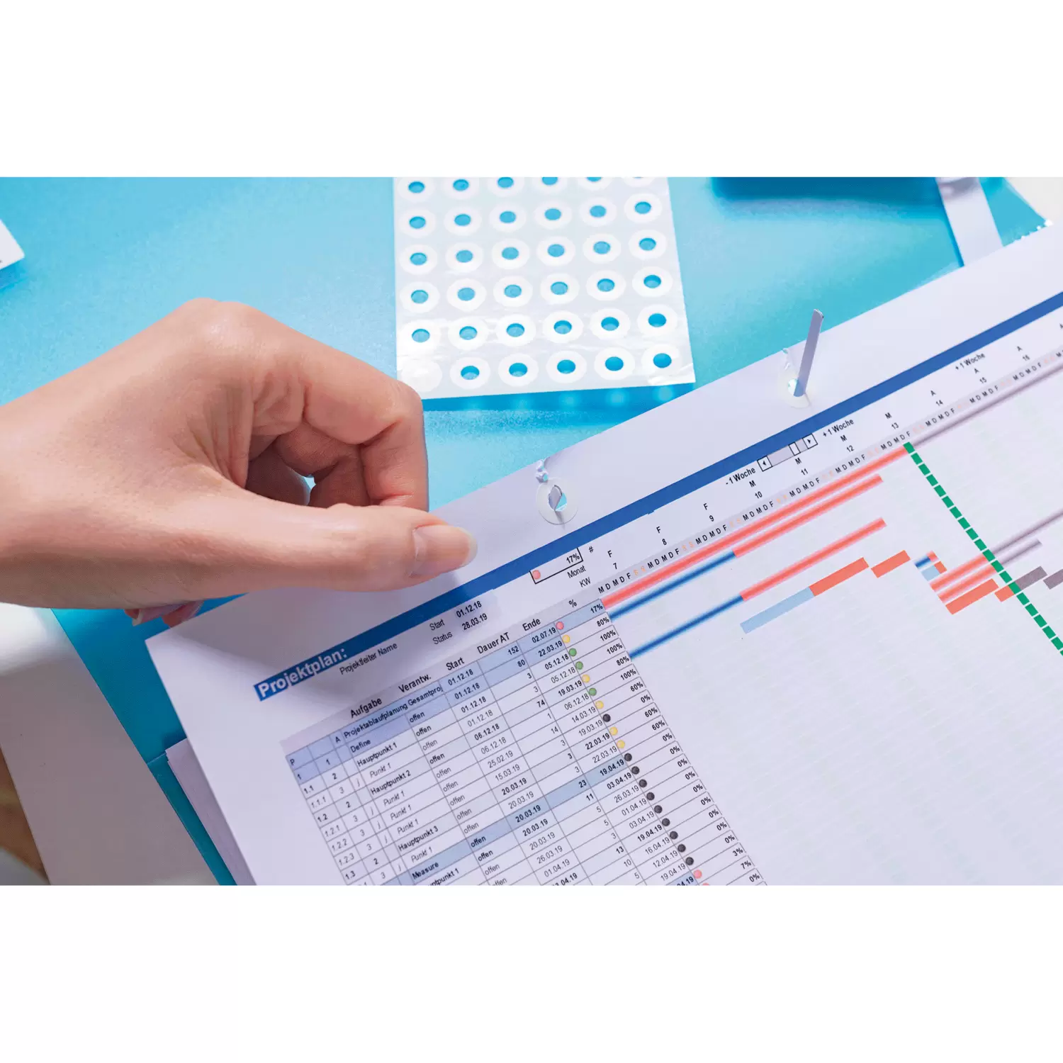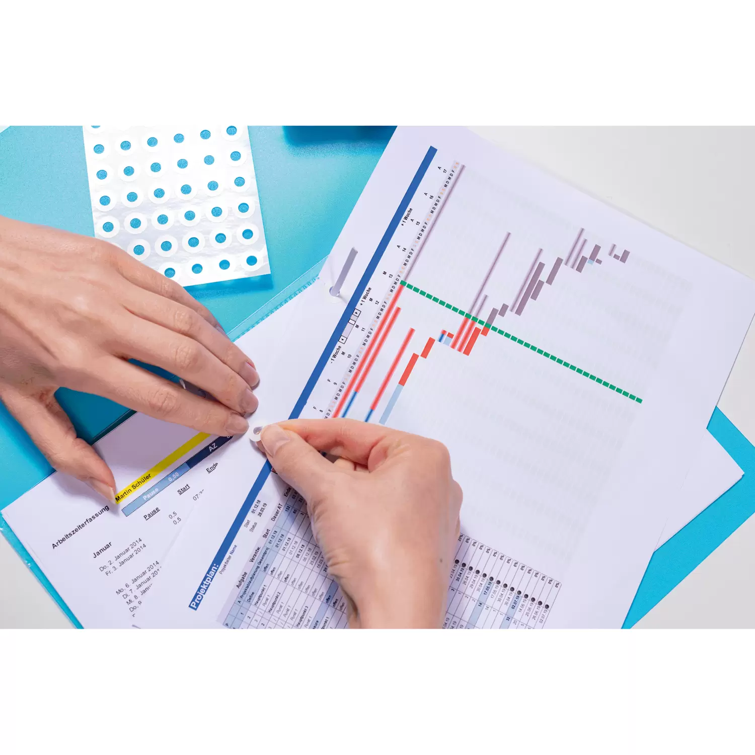 Zelfklevende versterkingsringen van scheurvrije kunststof folie, voorhet repareren van uitgescheurde perforaties. Buitenmaat: doorsnede 12 mm. In kartonnen dispenser.