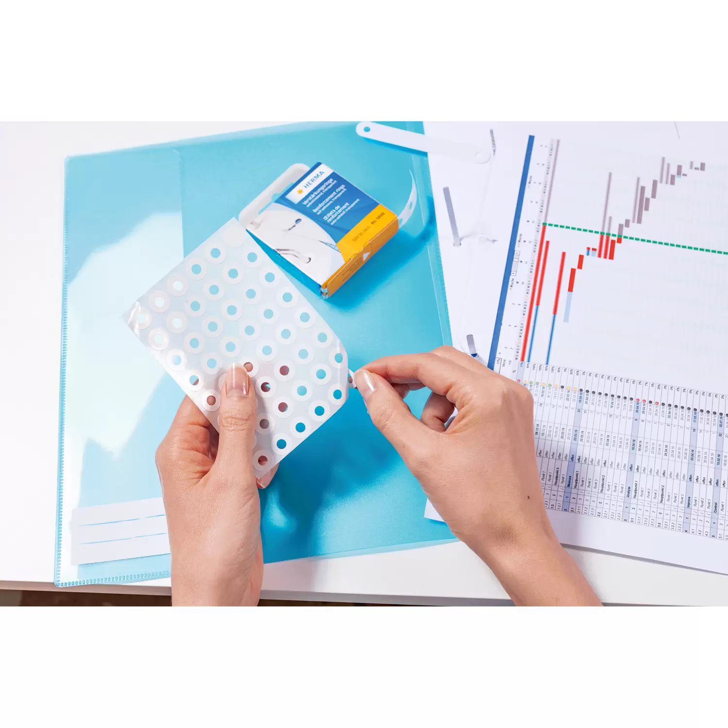 Zelfklevende versterkingsringen van scheurvrije kunststof folie, voorhet repareren van uitgescheurde perforaties. Buitenmaat: doorsnede 12 mm.