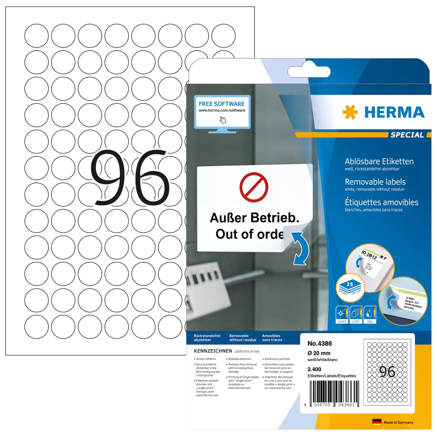 Verwijderbare etiketten, A4, Ø 20 mm, rond wit
