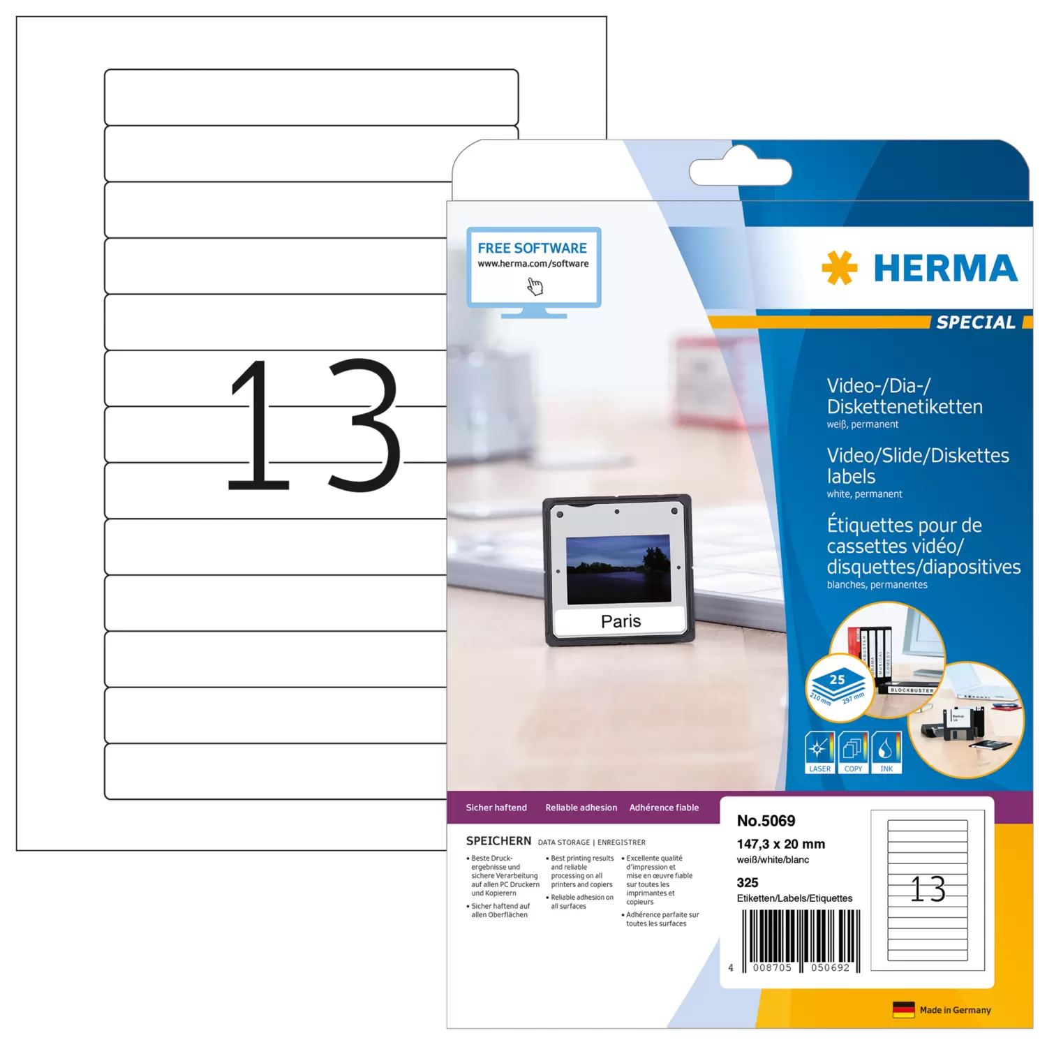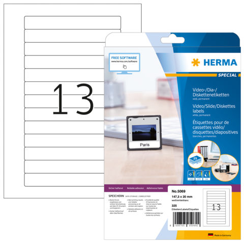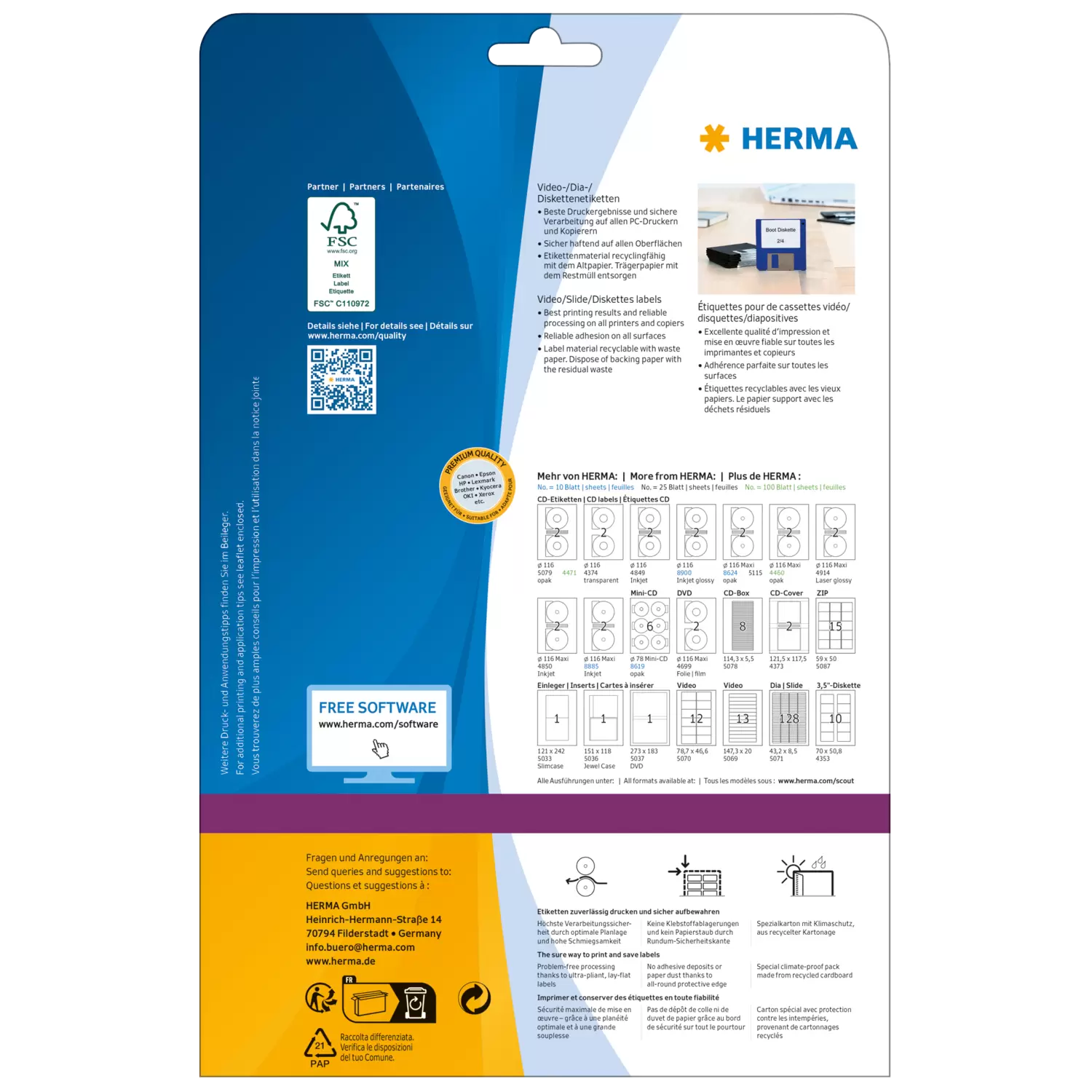 Etiketten voor VHS-videocassettes, op A4-vellen, zelfklevend. Zorgen voor orde en overzicht in het video-archief: ideaal voor het beschrijven van VHS-videocassettes (voorzijde of achterzijde). Milieuvriendelijk: hoogwaardig, chloorvrij gebleekt speciaal papier, FSC® Mix Credit-gecertificeerd, oplosmiddelvrije contactlijm. Zeer goede drukresultaten op alle laser- en inkjetprinters, kopieerapparaten, kleurenlaserprinters en kleurenkopieerapparaten. Storingvrije verwerking dankzij veiligheidsrand rondom en optimale vlakligging. Gratis softwareoplossingen: www.herma.com/software.