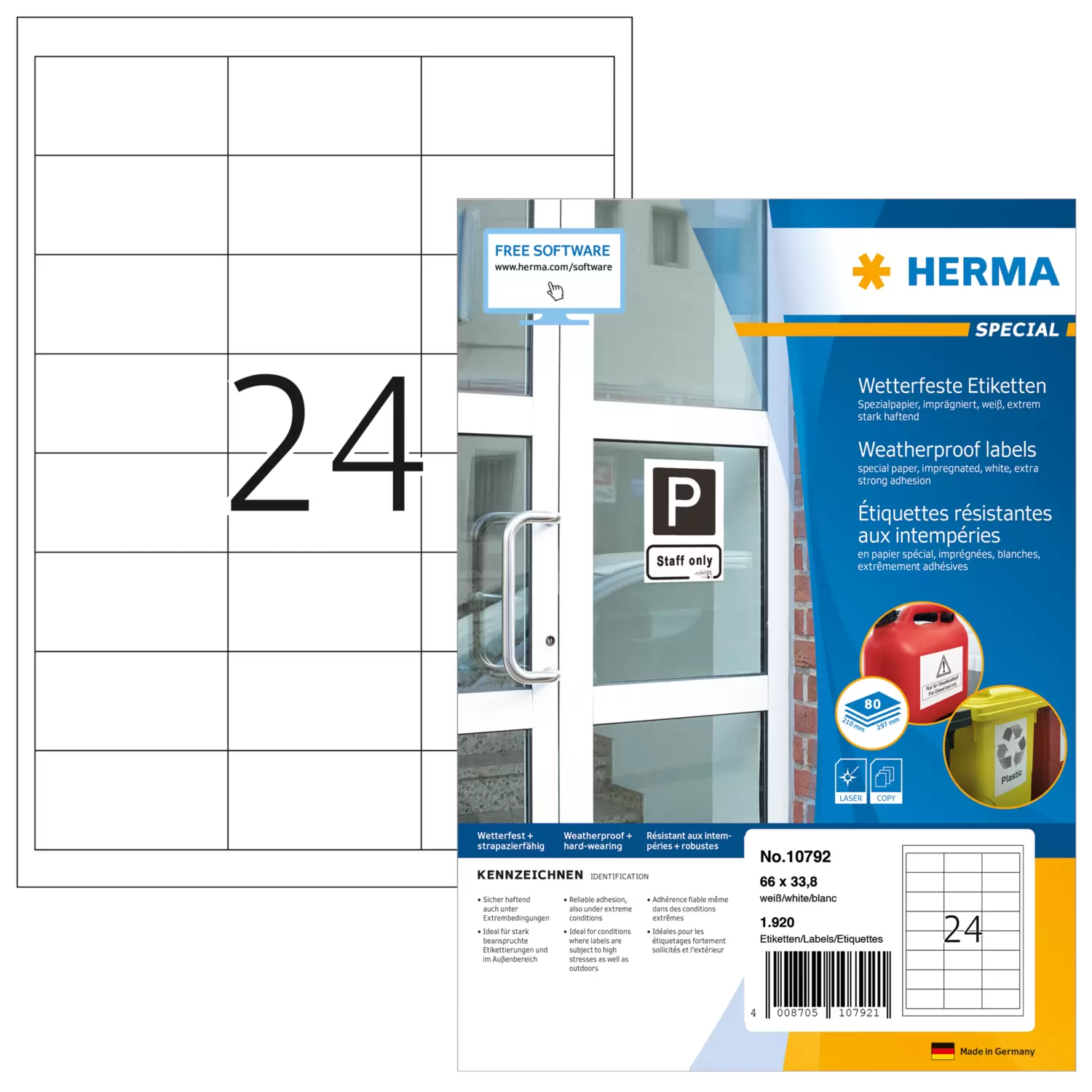 Etiketten van weerbestendig speciaal papier, zelfklevend. Van geïmpregneerd, wit speciaal papier, extreem sterk hechtend, ook op kritische oppervlakken. Ideaal voor etiketten op zwaar belaste plaatsen en buiten. Water, olie en vuil afstotend, verouderingsbestendig, zeewaterbestendig. Temperatuurbestendig van -30 tot 80 °C. Ondergrondmateriaal van chloorvrij gebleekte celstof, oplosmiddelvrije contactlijm. Voor laserprinters en kopieermachines. Niet geschikt voor inkjetprinters, kleurenlaserprinters en kleurenkopieerapparaten. Gratis softwareoplossingen: www.herma.com/software.