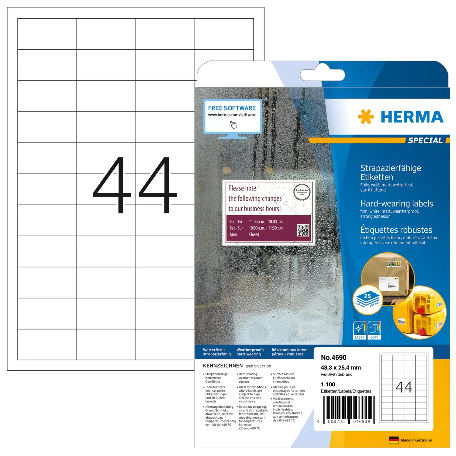 Mat witte folie-etiketten op A4-vellen, zelfklevend. Ideaal voor etiketten op zwaar belaste plaatsen en buiten: eigendomsetiketten, etalagestickers, attentie- en waarschuwingsplaatjes, labelen in het magazijn en in de productie. Slijt- en weervast oppervlak, zeer sterk hechtend, verouderingsbestendig, olie en vuil afstotend, afwasbaar, temperatuurbestendig van -30 tot 80 °C, zeewaterbestendig. Storingvrije verwerking dankzij veiligheidsrand rondom en optimale vlakligging. Voor laserprinters en kopieerapparaten, kleurenlaserprinters en kleurenkopieerapparaten. Niet geschikt voor inkjetprinters. Gratis softwareoplossingen: www.herma.com/software.