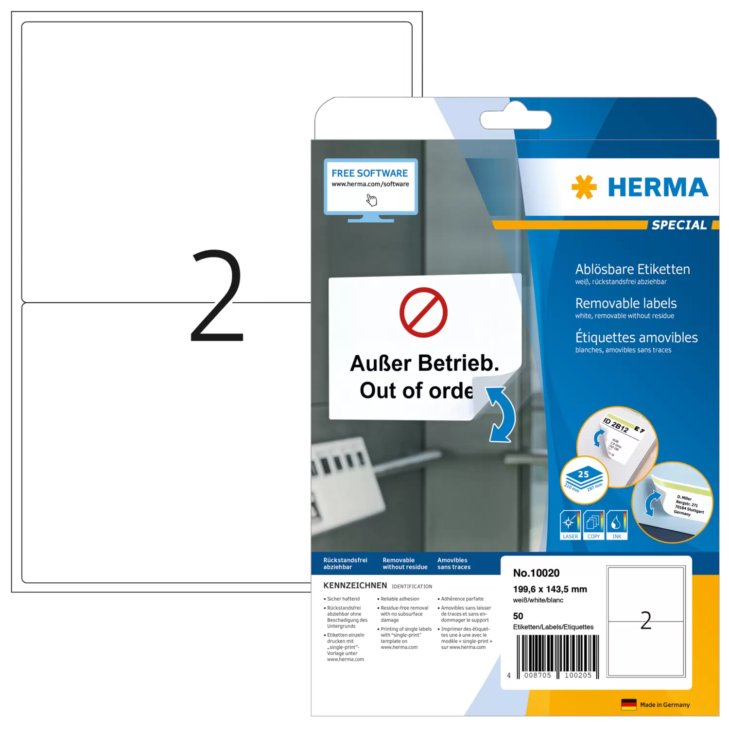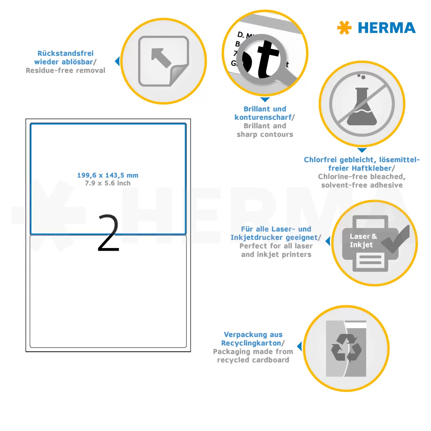 Zelfklevende etiketten op A4-vellen. Stevig hechtend op alle gladde, droge, onbeschadigde en stofvrije oppervlakken. Te verwijderen zonder resten achter te laten en zonder de ondergrond te beschadigen. Ideaal voor het tijdelijk of wisselend labelen en voor oppervlakken die niet mogen worden beschadigd. Zeer goede drukresultaten op alle laser- en inkjetprinters, kopieerapparaten, kleurenlaserprinters en kleurenkopieerapparaten. Storingvrije verwerking dankzij veiligheidsrand rondom en optimale vlakligging. Milieuvriendelijk: FSC® Mix Credit-gecertificeerd, chloorvrij gebleekt, oplosmiddelvrije contactlijm. Etiketten zijn 100 % recyclebaar via het oud papier, verpakking van gerecycled karton. Gratis softwareoplossingen: www.herma.com/software.