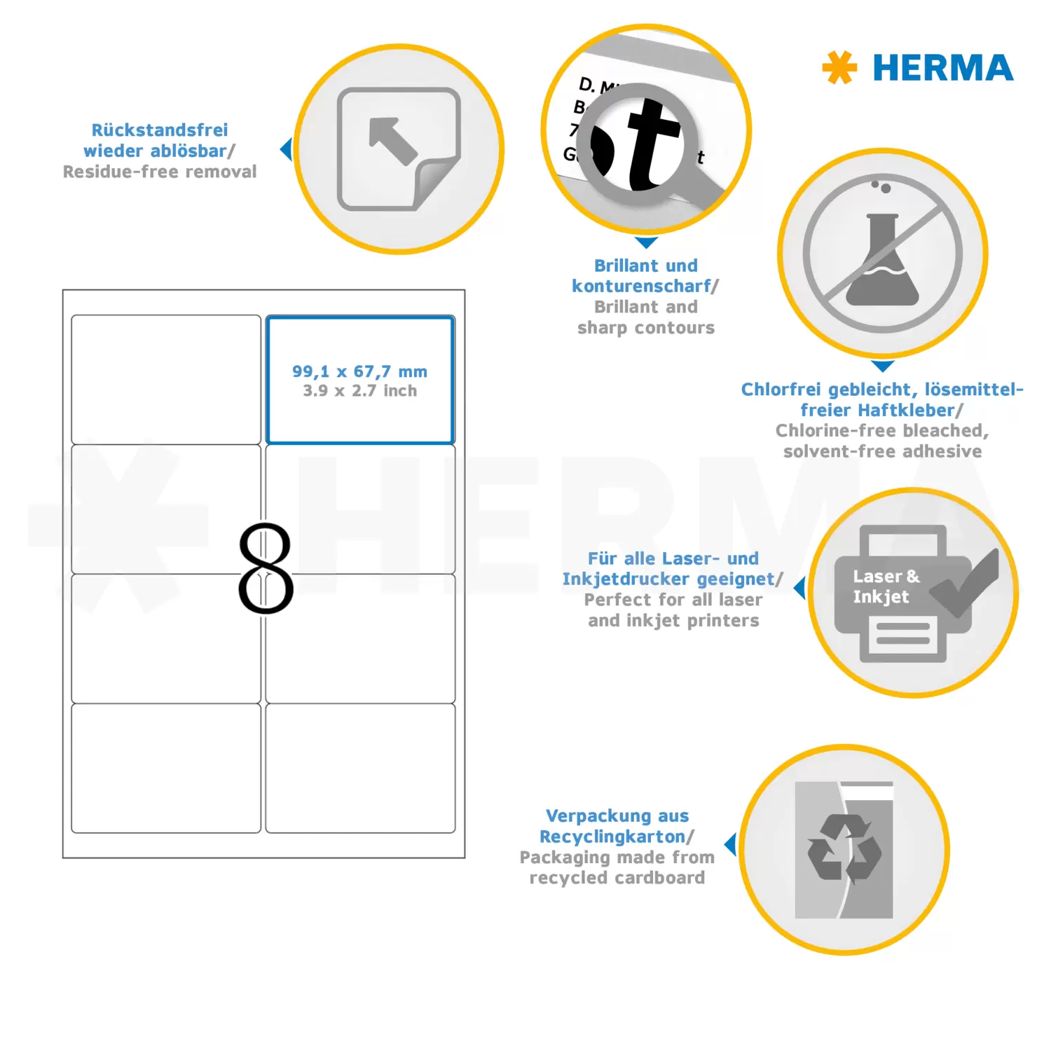Zelfklevende etiketten op A4-vellen. Stevig hechtend op alle gladde, droge, onbeschadigde en stofvrije oppervlakken. Te verwijderen zonder resten achter te laten en zonder de ondergrond te beschadigen. Ideaal voor het tijdelijk of wisselend labelen en voor oppervlakken die niet mogen worden beschadigd. Zeer goede drukresultaten op alle laser- en inkjetprinters, kopieerapparaten, kleurenlaserprinters en kleurenkopieerapparaten. Storingvrije verwerking dankzij veiligheidsrand rondom en optimale vlakligging. Milieuvriendelijk: FSC® Mix Credit-gecertificeerd, chloorvrij gebleekt, oplosmiddelvrije contactlijm. Etiketten zijn 100 % recyclebaar via het oud papier, verpakking van gerecycled karton. Gratis softwareoplossingen: www.herma.com/software.